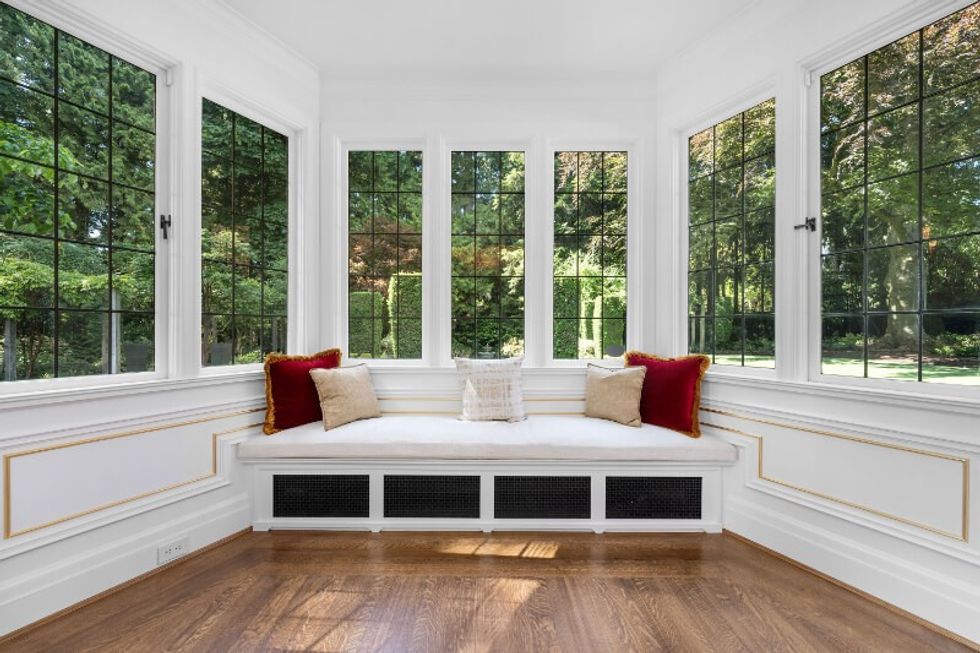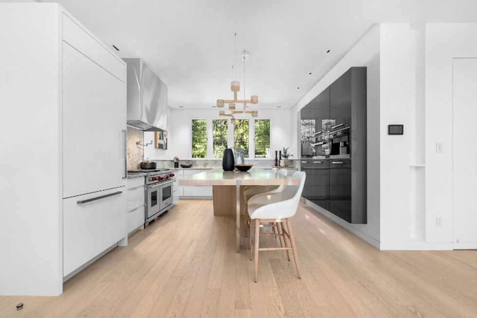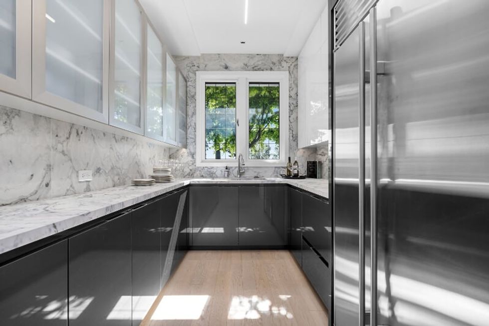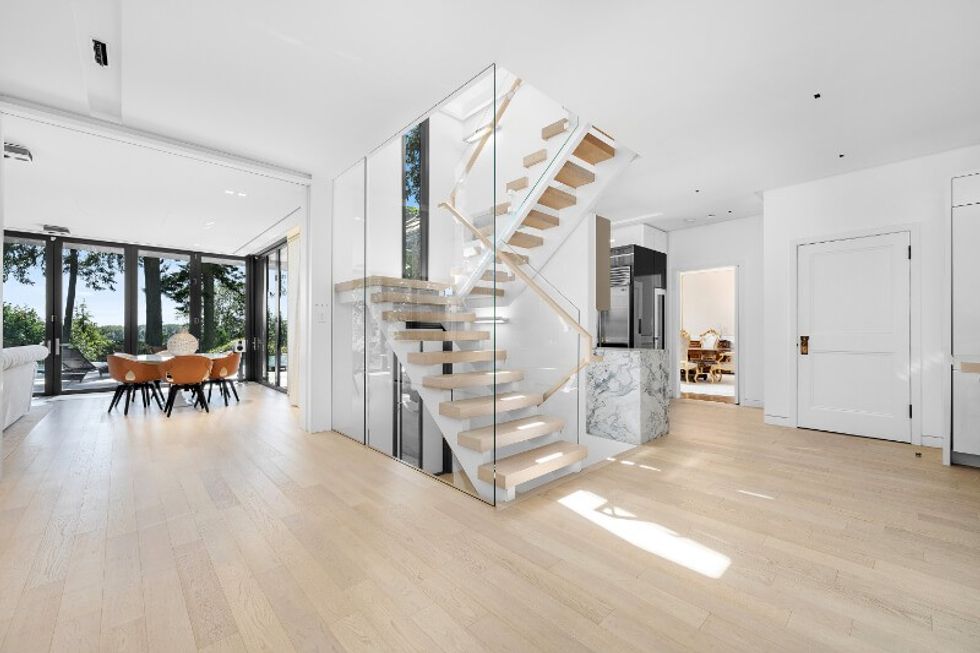 The open-concept living area is one space (among several) that challenges the "age" of the Gable Estate. The living room is set against chic floor-to-ceiling windows that stretch wall to wall, the kitchen cabinetry features minimalistic design and ultra-modern tones, and the space is anchored by a contemporary centrepiece staircase that's enclosed in glass.