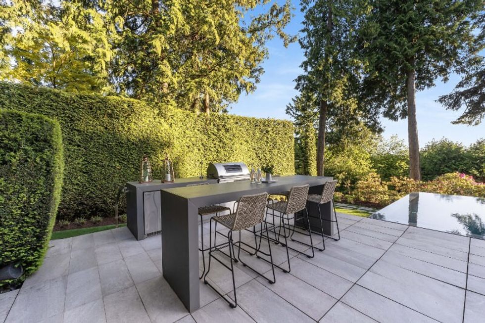 Last, but certainly not least, the home's exterior is waiting. Step out back to discover a spacious patio, which provides luxurious lounge space, dining space, bar space, and then some. Then there's the showstopper: a 65-ft, one-of-a-kind infinity pool, serving as the backyard's centrepiece.