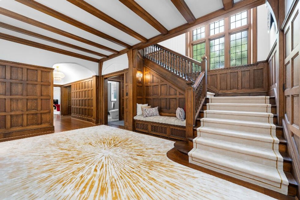 A massive driveway with — when the garage is considered — enough space for up to 10 vehicles, and a beautifully landscaped garden (anchored by a marble water fountain) lead to the home's entryway. On arrival, classical wood designs add to the Tudor-style aesthetic.