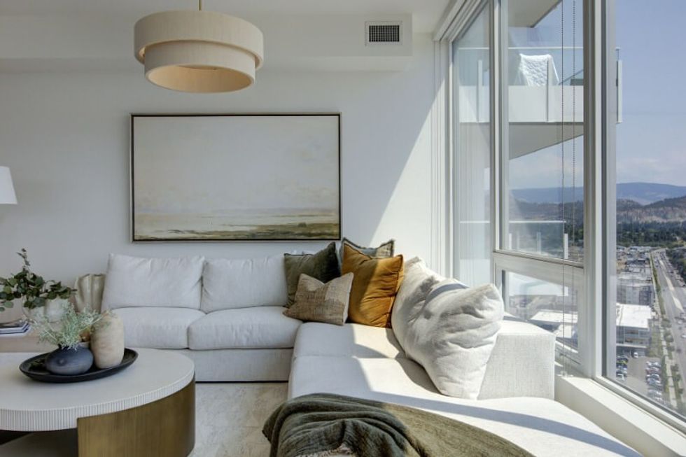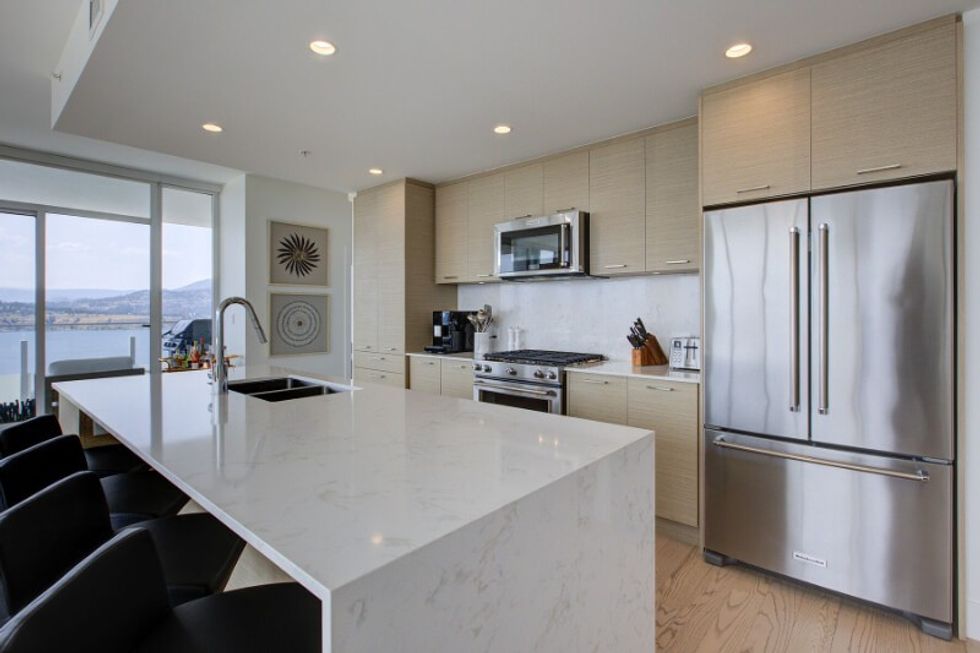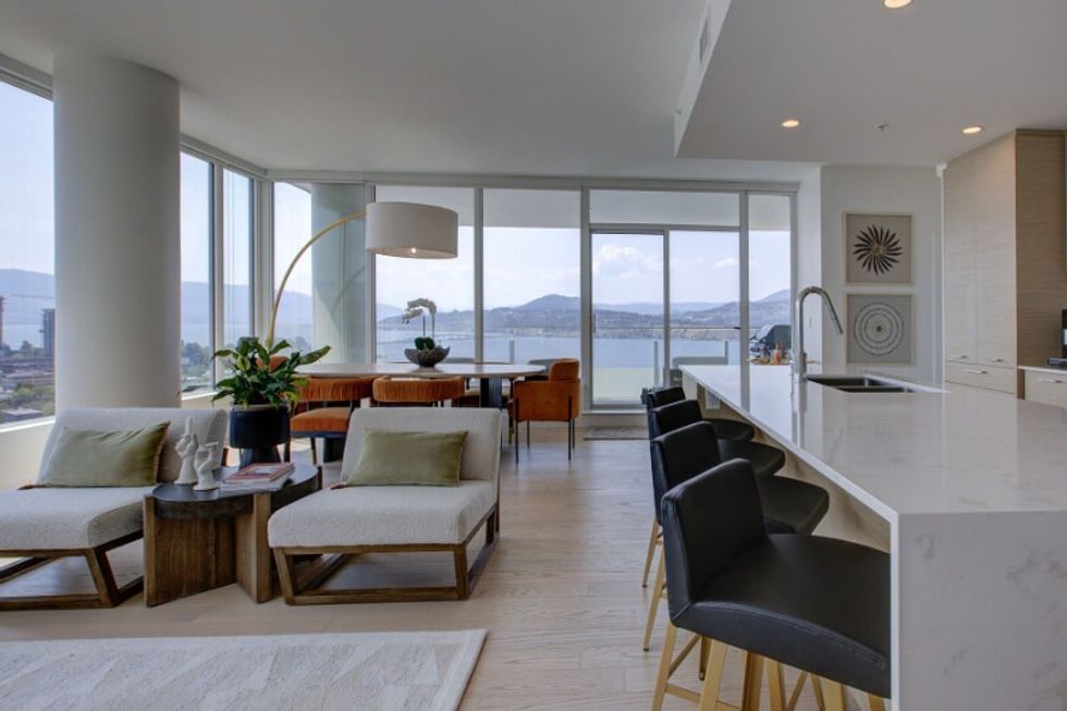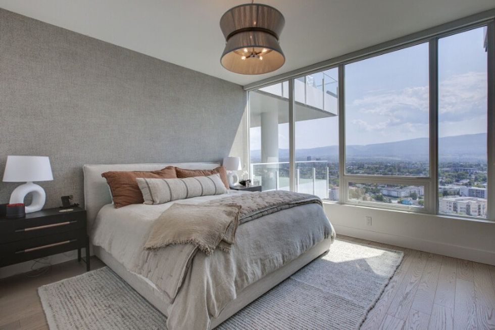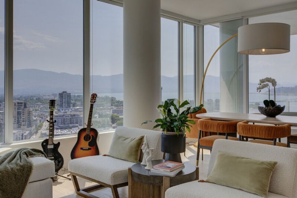 It's abundantly clear that this suite has been carefully and thoughtfully designed. The entire dwelling, save for the bathrooms, sits atop hardwood floors, which are lightly toned and create a calm and neutral feel within the space. The abode also makes use of distinguishing finishes such as quartz countertops, designer lighting, and wall accents, resulting in a welcoming-yet-refined atmosphere (that perfectly pairs with those sprawling Kelowna views).