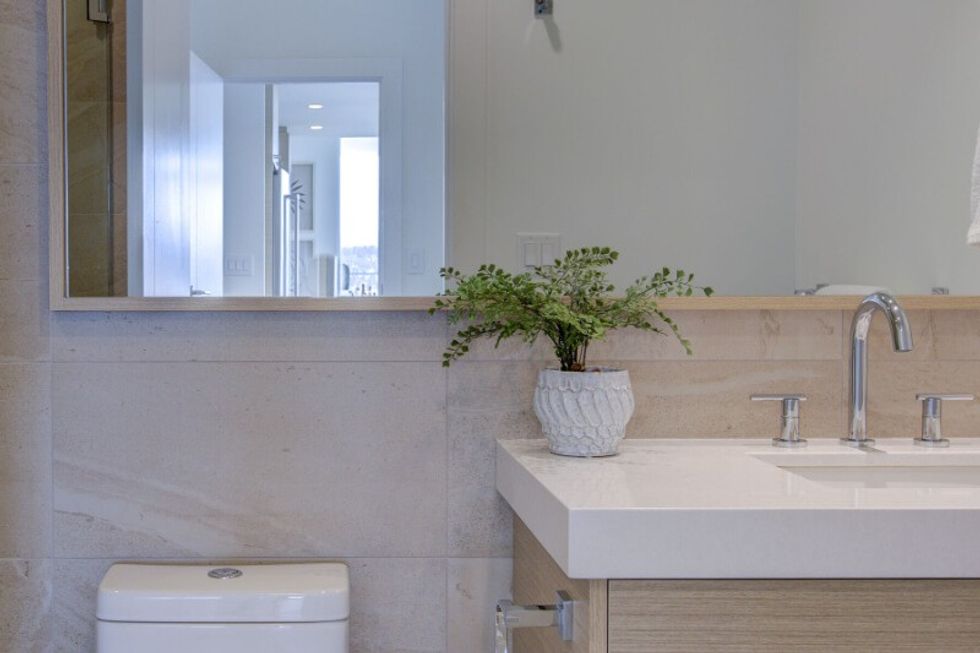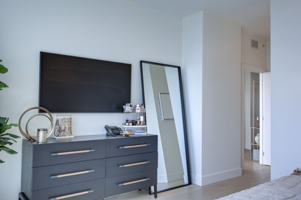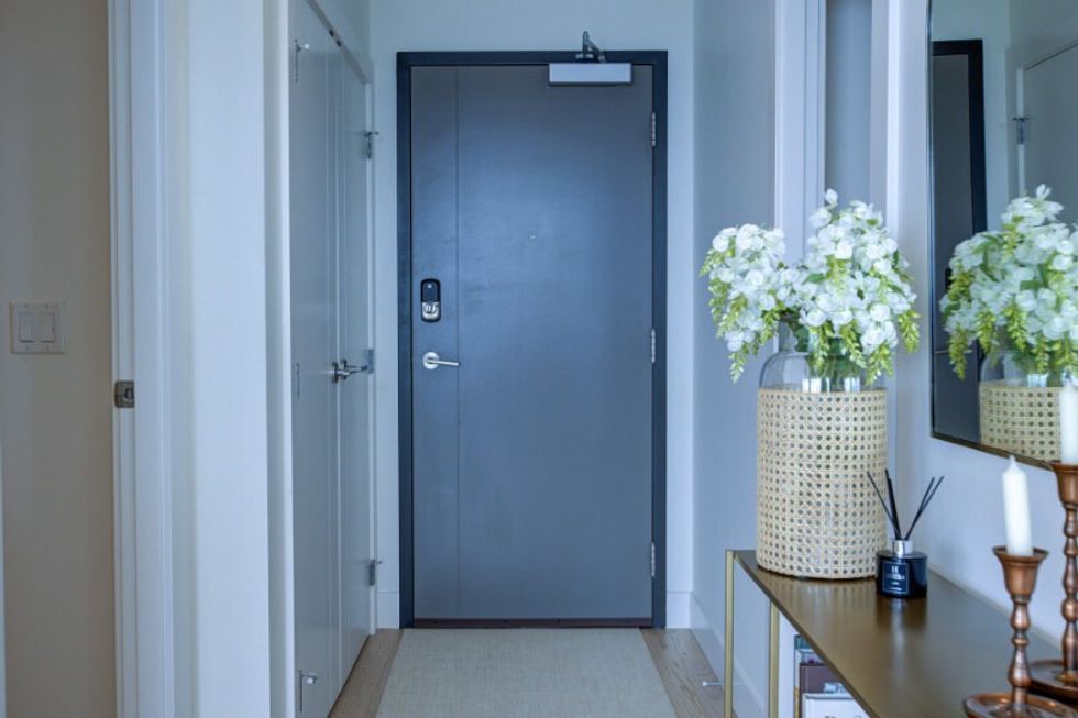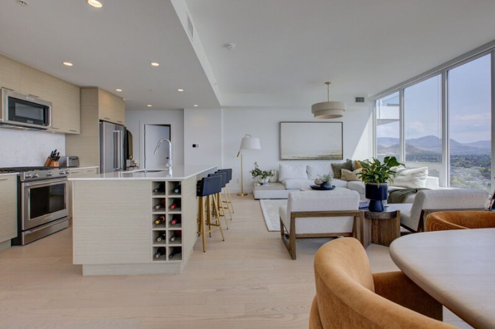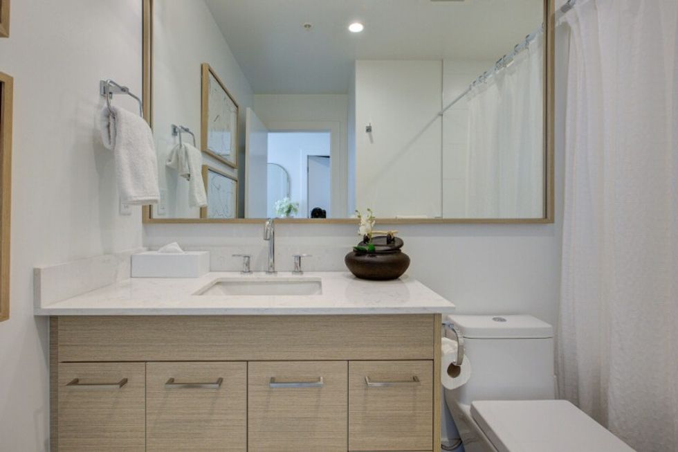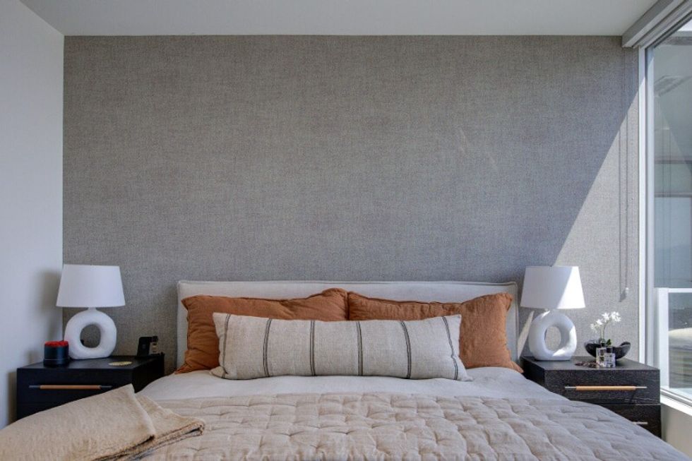 It's abundantly clear that this suite has been carefully and thoughtfully designed. The entire dwelling, save for the bathrooms, sits atop hardwood floors, which are lightly toned and create a calm and neutral feel within the space. The abode also makes use of distinguishing finishes such as quartz countertops, designer lighting, and wall accents, resulting in a welcoming-yet-refined atmosphere (that perfectly pairs with those sprawling Kelowna views).