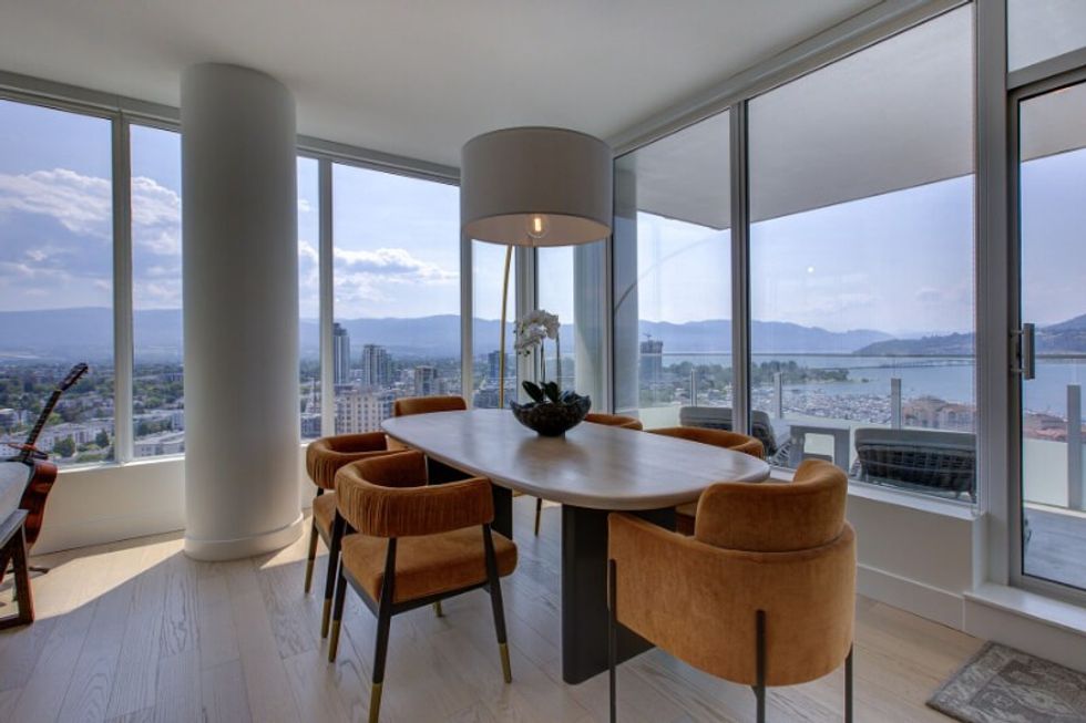 The home's central living area consists of the kitchen, dining room, and living room, laid out across a modern open floor plan, with two full walls of floor-to-ceiling windows overlooking downtown Kelowna. The kitchen is equipped with a collection of built-in stainless steel appliances, the living room is flooded with natural light, and the dining space extends out to the balcony.