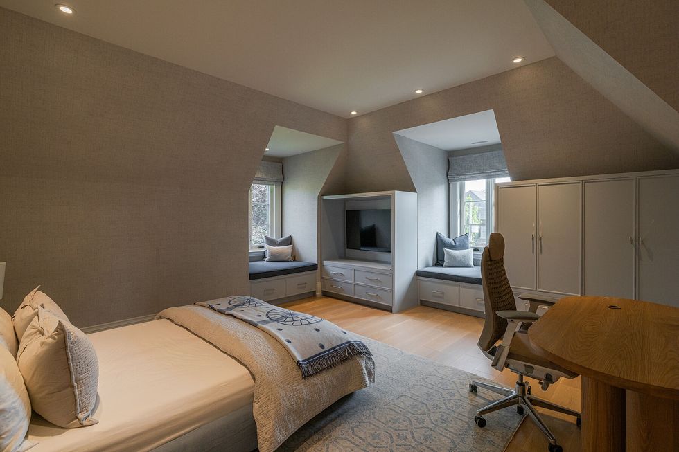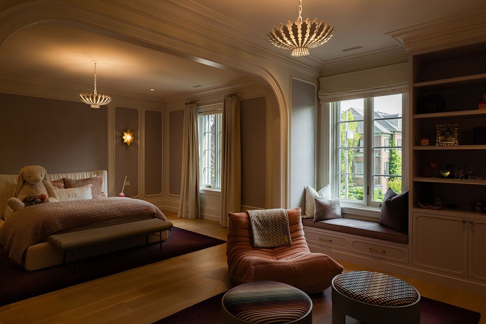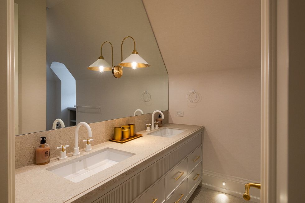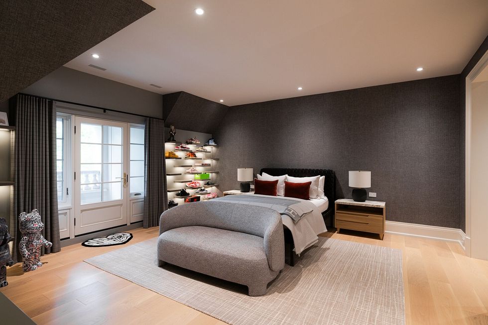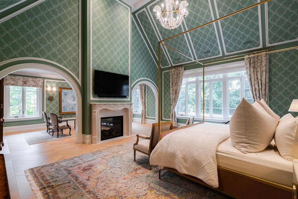 The primary suite offers a moment of quiet majesty. Here, vaulted ceilings and arched accents set the tone for a space that feels both private and palatial. An intimate fireside lounge adds to the atmosphere, but the crown jewel is a two-storey dressing room, inspired by couture ateliers and connected by a spiral staircase beneath a glowing chandelier. The ensuite bath, finished in stone and sculptural fixtures by Shirley Wagner, completes the suite’s spa-like sensibility.