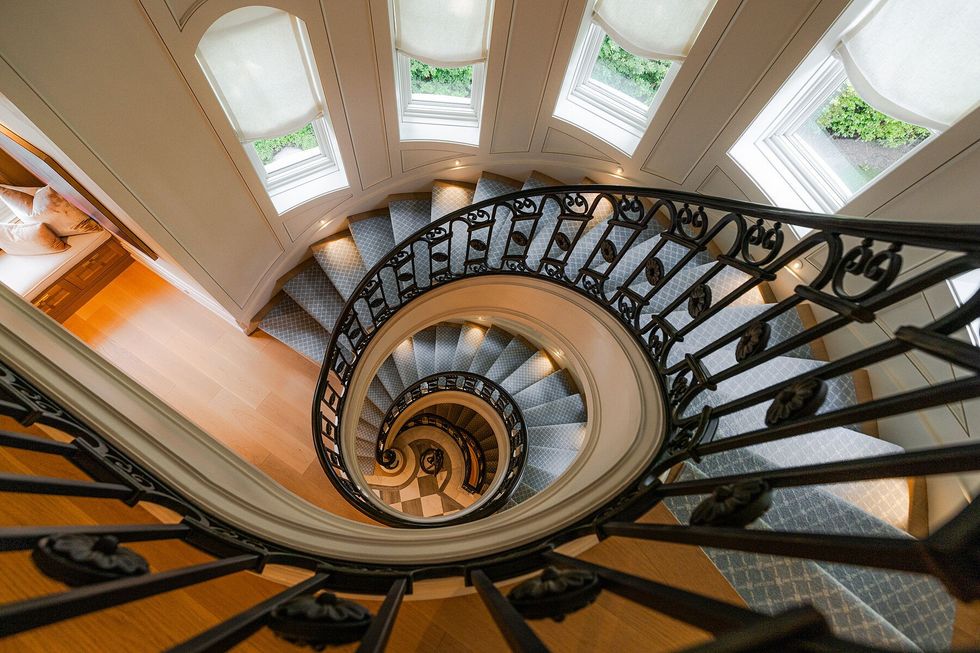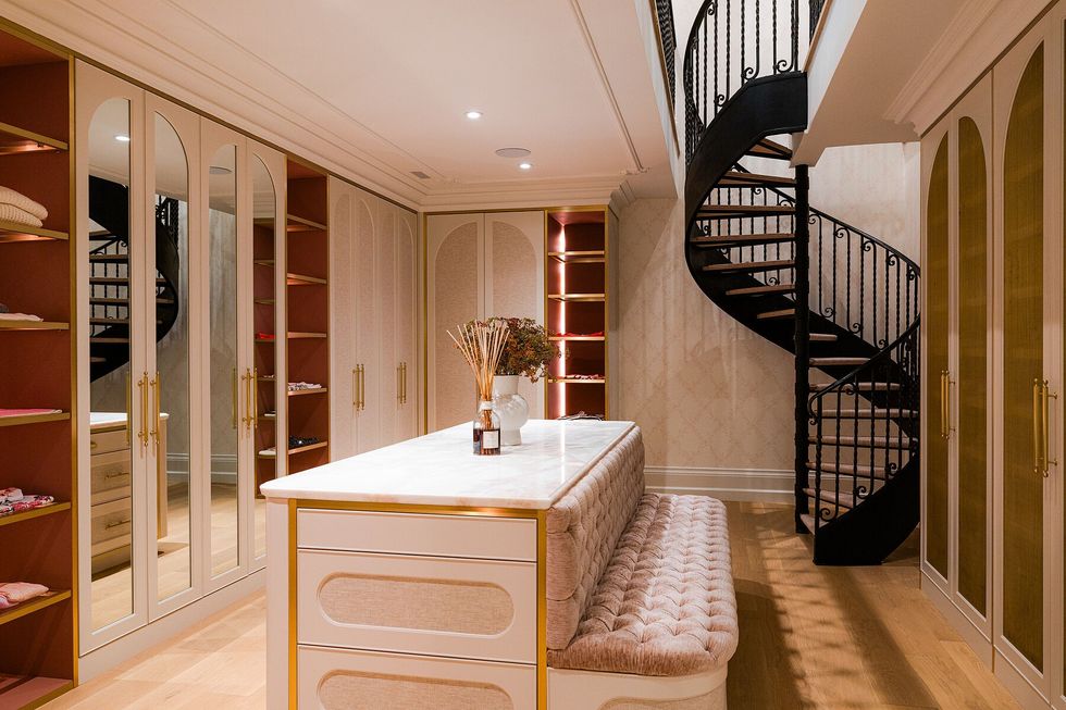 The two-storey dressing room is nothing short of theatrical. With its spiral staircase, chandelier, and boutique-like layout, it transforms a private routine into a daily ritual of luxury.
