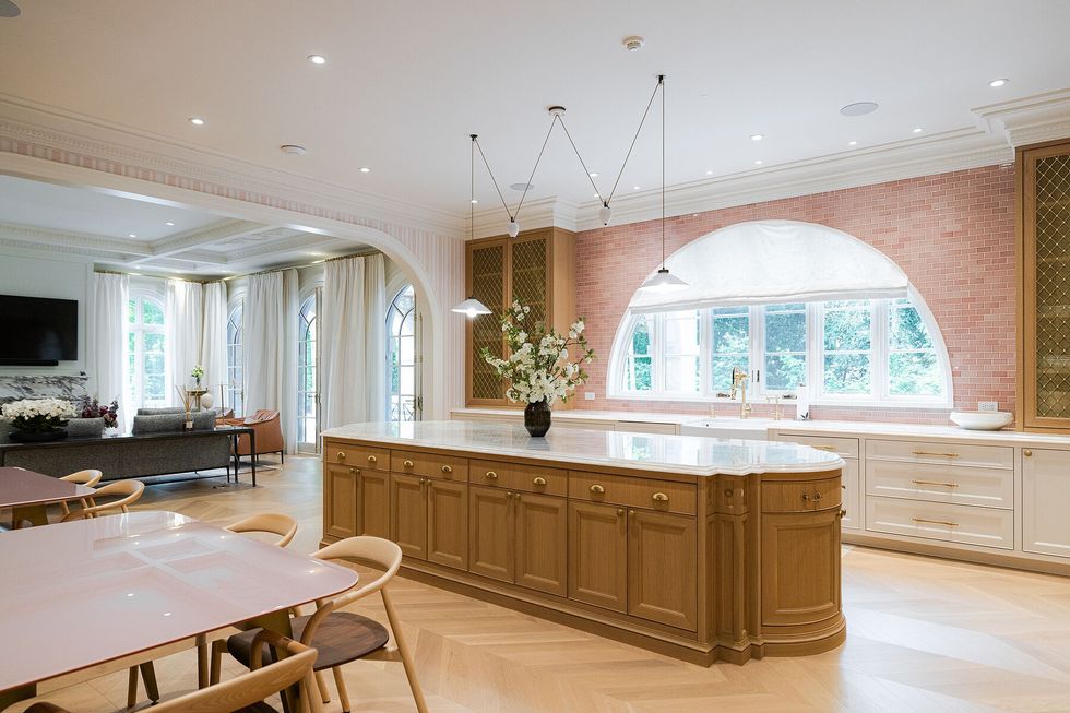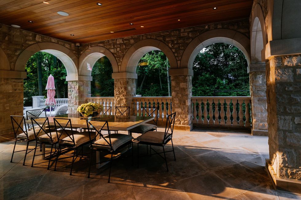 A formal dining room, scaled for 20 guests, flows effortlessly into a designer kitchen where hand-painted Portuguese tiles meet bespoke millwork by Emanuele Furniture Design. Just beyond, the family room invites unhurried living — with a hand-carved fireplace and French doors that dissolve the line between indoors and out.