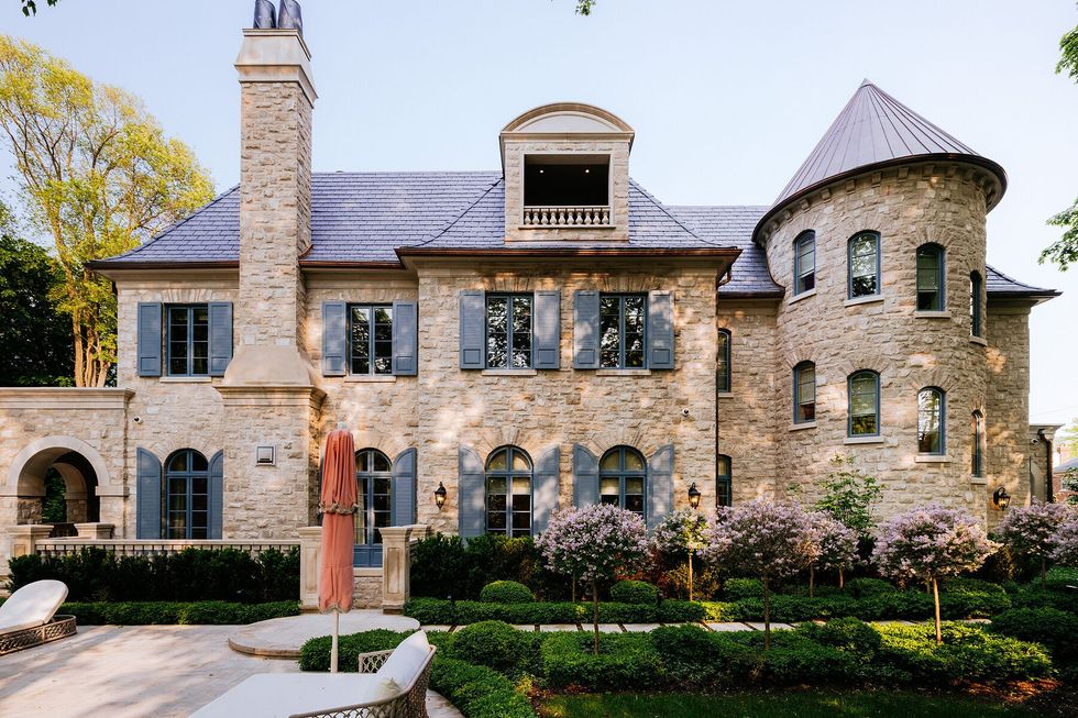 From the curb, the property’s presence is immediately cinematic. Its stately limestone façade, symmetrical proportions, and gently arched windows recall the refined romance of the French countryside. Weathered-blue shutters lend a painterly touch, while a turreted corner and sweeping loggia gesture toward chateau-style grandeur.