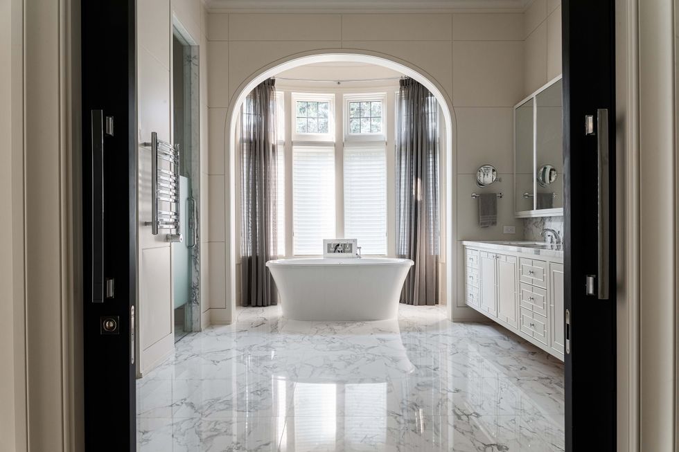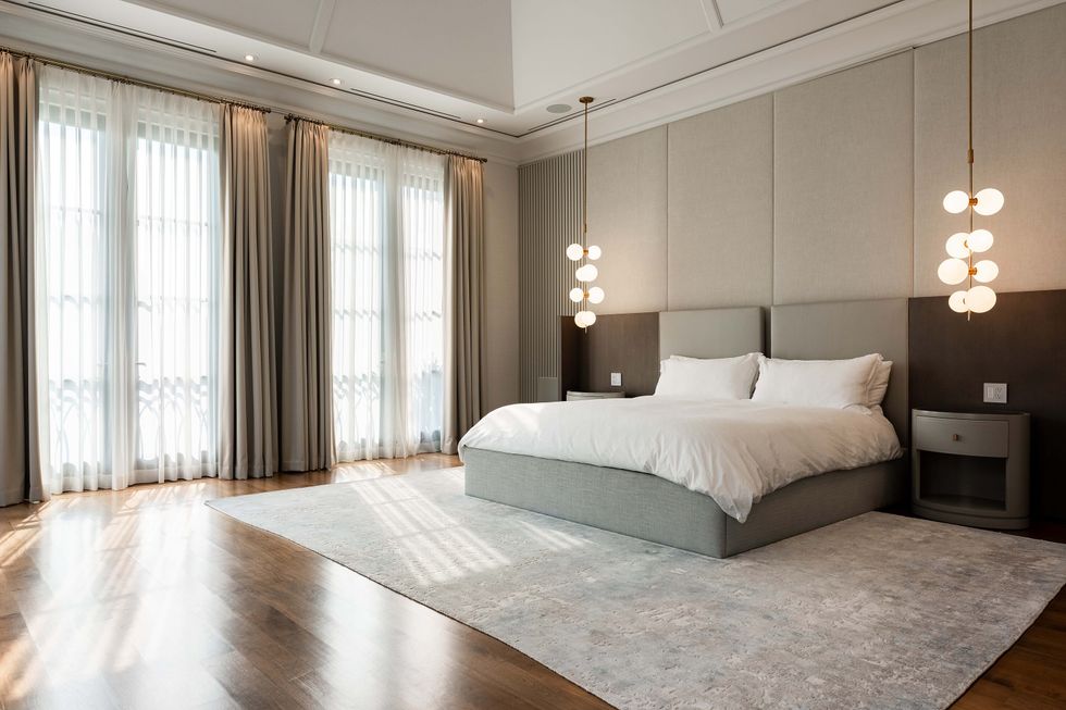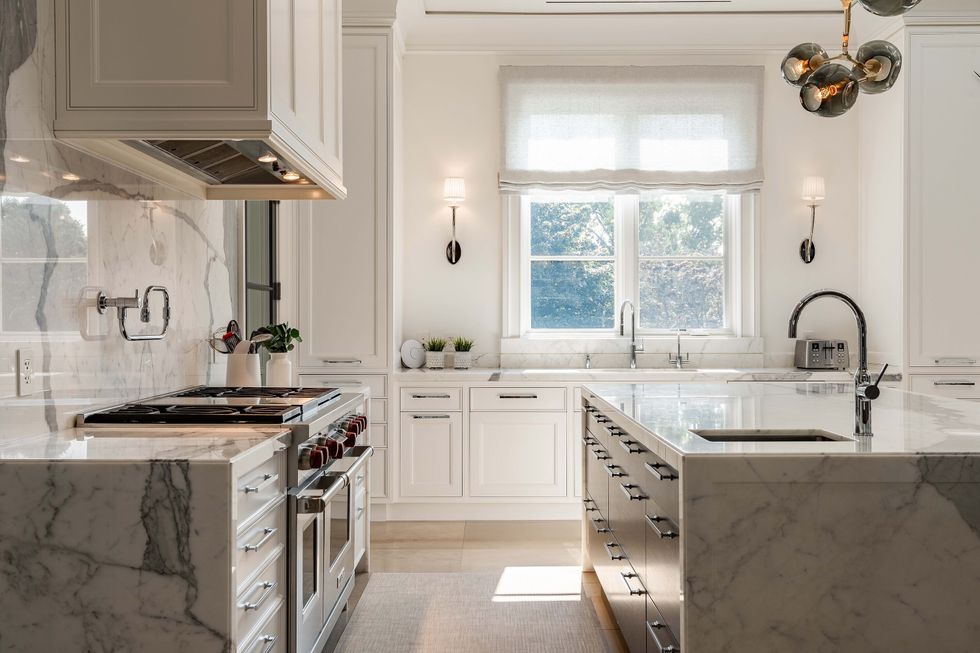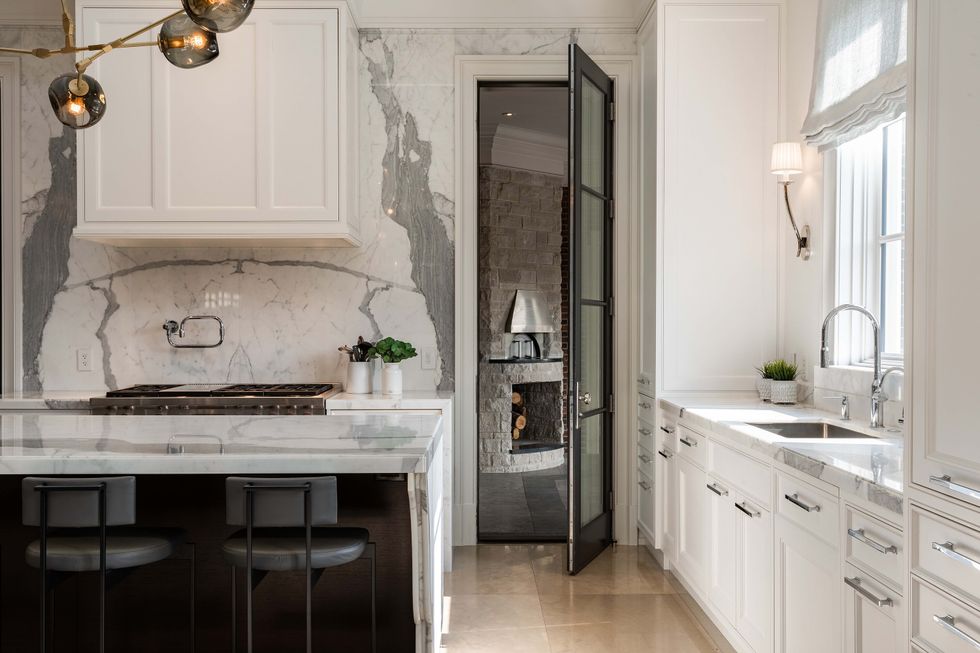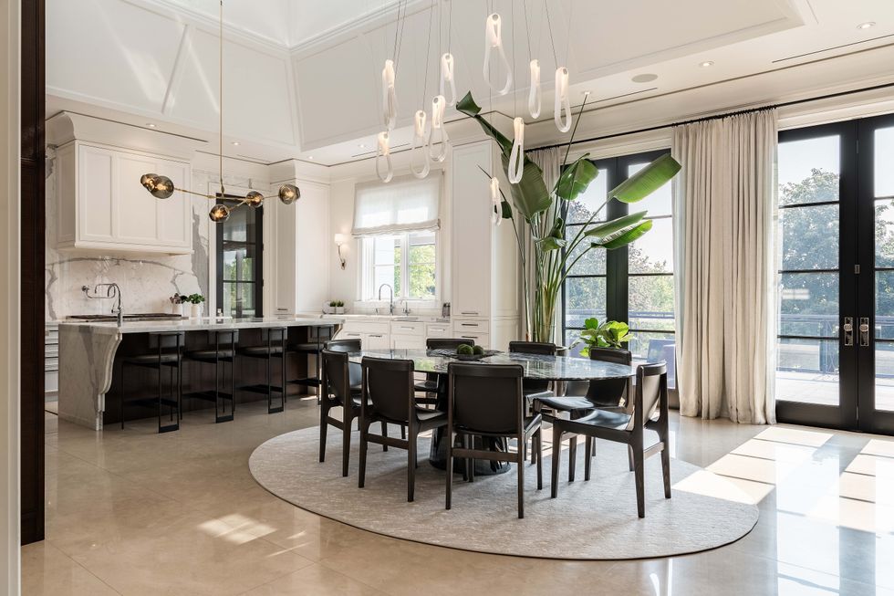 In the kitchen — a chef's paradise — make use of top-of-the-line appliances, a walk-in wine cellar, and a walk-out to the terrace, where outdoor dining and lounging options await. The kitchen itself is glorious, bedecked in white marble beautifully illuminated by light flooding in through a wall of windows.