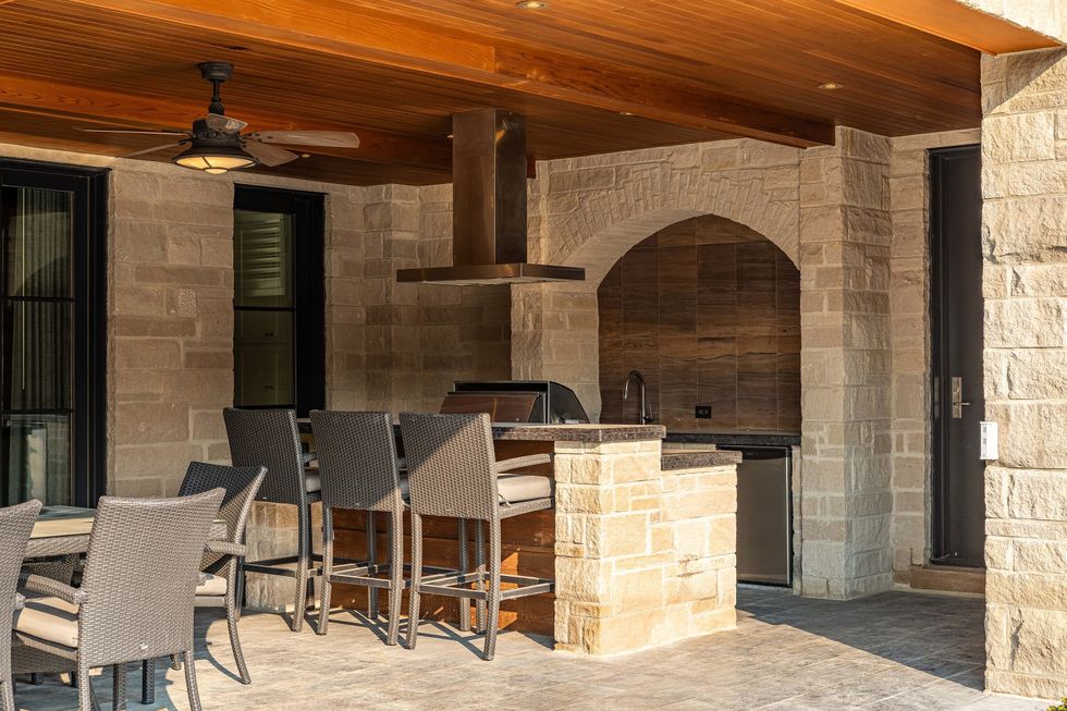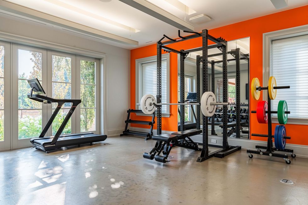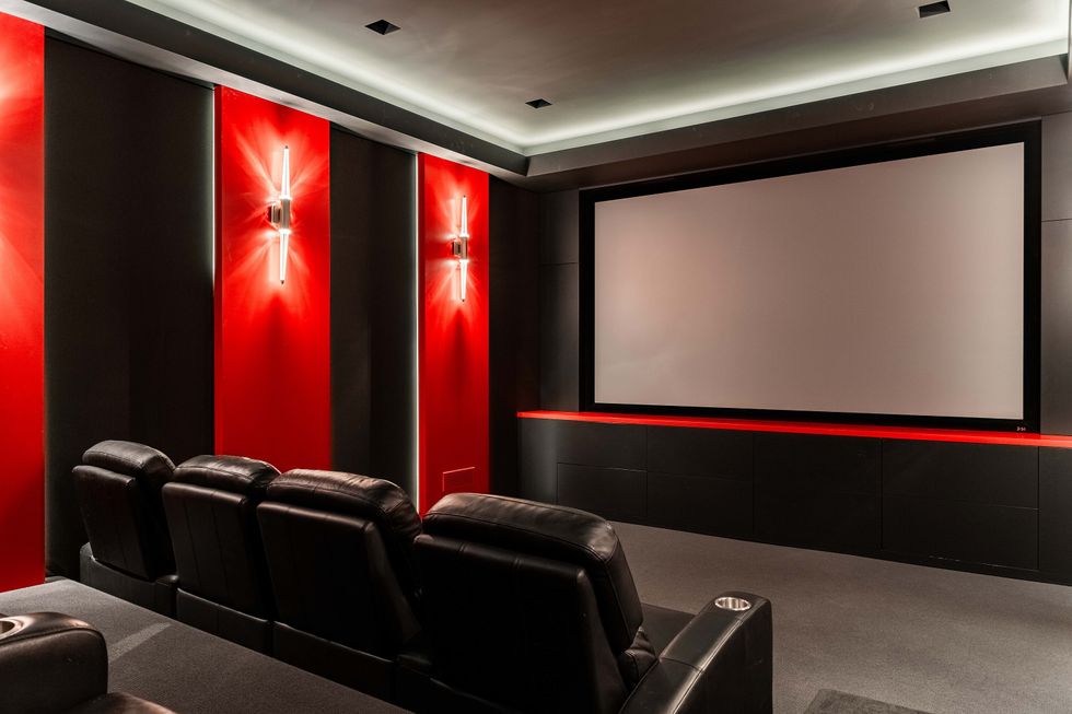 Now for the fun. Head downstairs to pass the time with an activity of your choice, from the home gym and spa, to a theatre room, golf simulator, and wet bar, there's plenty to choose from. The gym and spa area lead out to the backyard, where more fun awaits in the form of an outdoor pizza oven and built-in BBQ, in-ground hot tub and pool, and of course, the sports court.