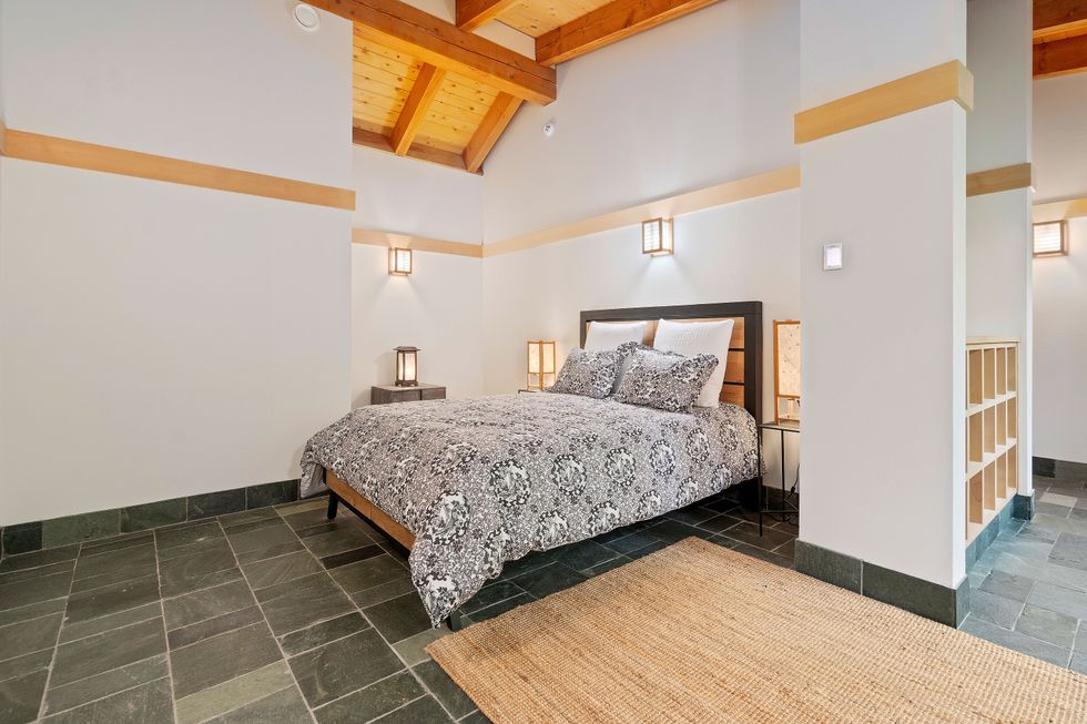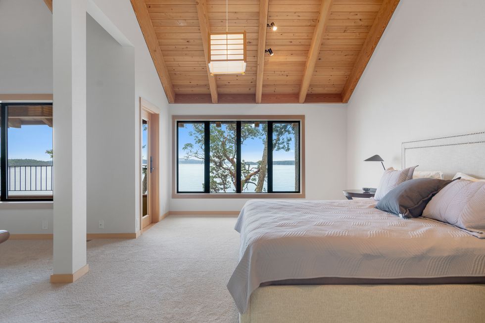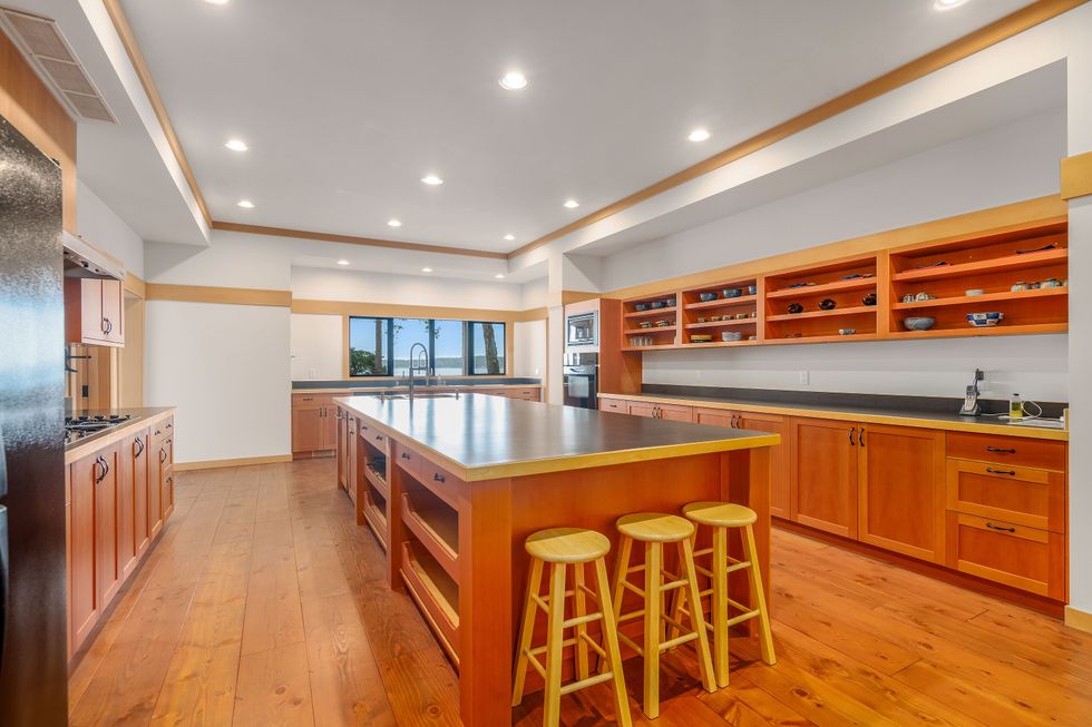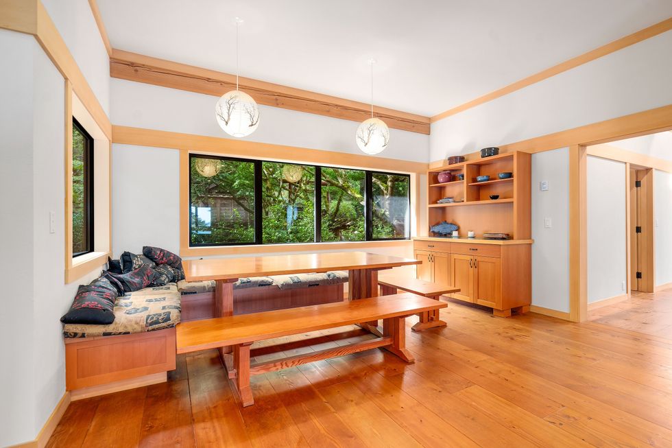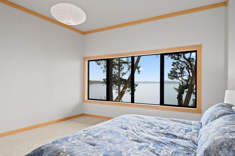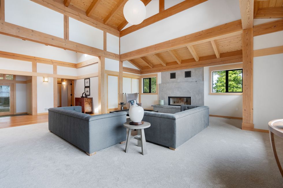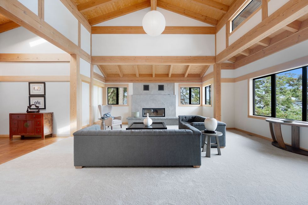 Built by esteemed Salt Spring Islander Robert Langevin, the estate — located at 250 Holmes Road — is a contemporary timber-frame masterpiece, incorporating rich natural woods throughout. Reclaimed wide-plank Douglas Fir floors and natural slate — complemented by radiant heating — set the tone for warmth and refinement, while custom yellow cedar millwork brings a sense of artisanal craftsmanship to every corner.