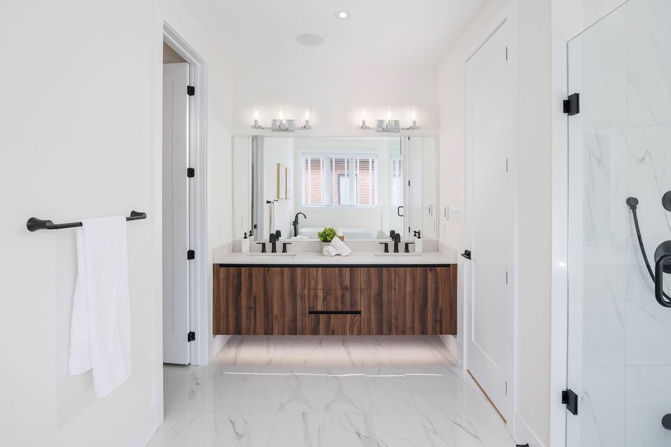 Upstairs, nine-foot ceilings add grandeur to the four large bedrooms, each complete with its own thoughtful design elements. The primary suite is a true retreat: it features an incredible forest and lake view, fireplace, dual custom walk-in closets, and a spa-worthy five-piece ensuite with heated floors, a soaker tub, and an oversized glass shower.