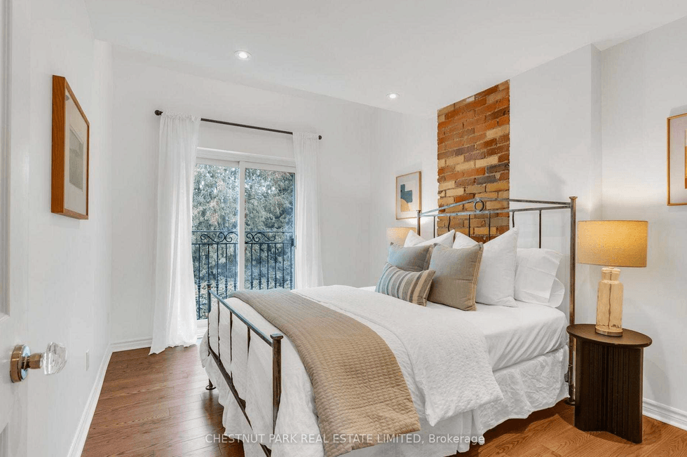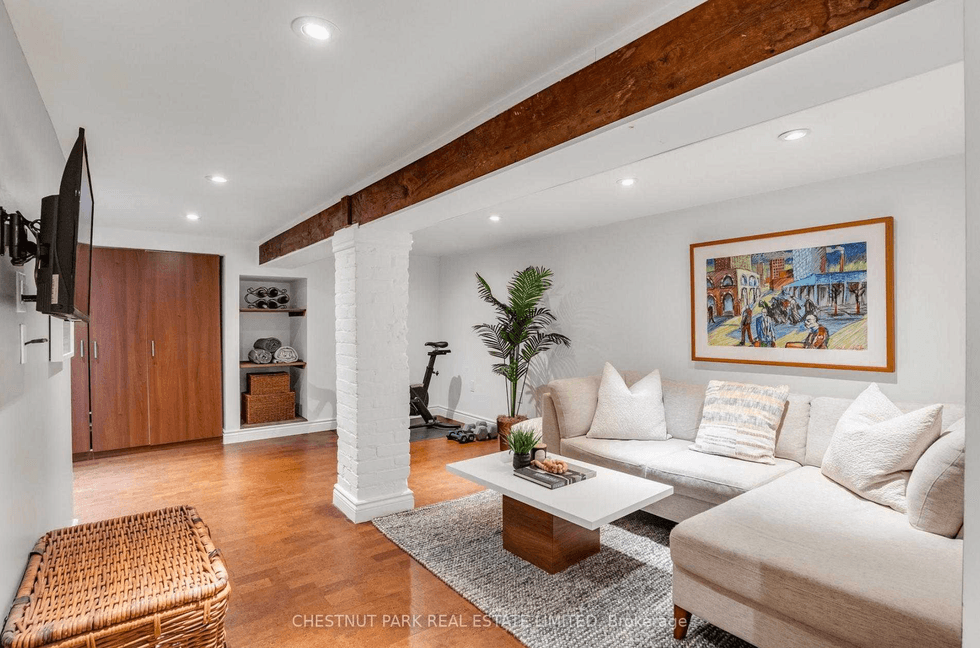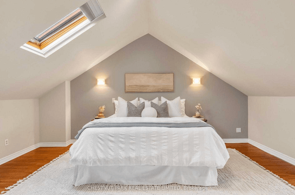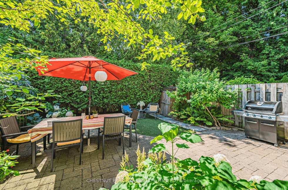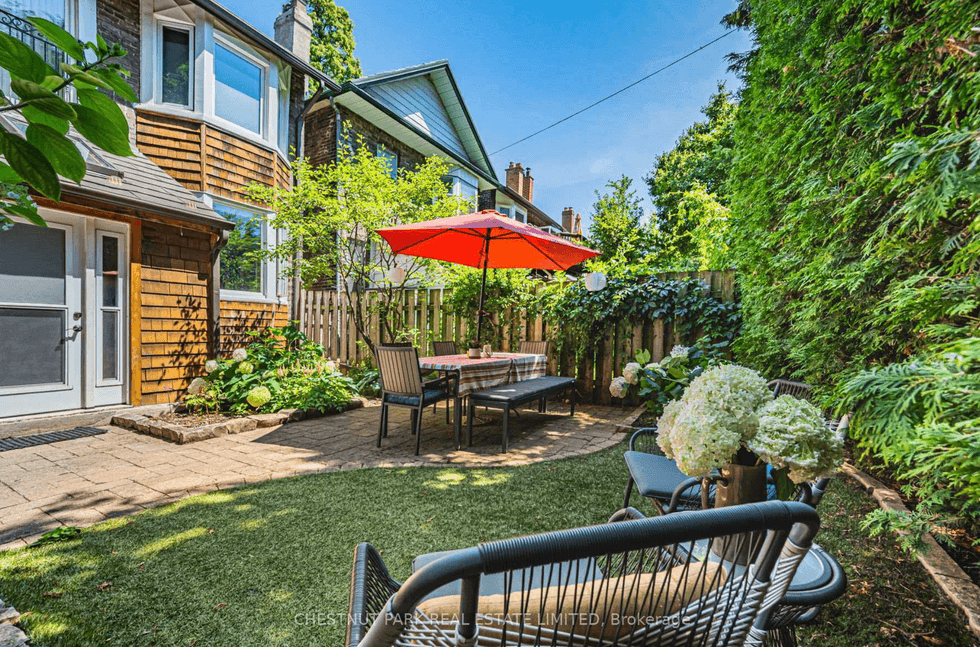 Outside, the professionally landscaped backyard — mature cedar hedges, lush greenery, and a patio — was notable enough to be featured on One Garden, Two Looks. The upgrades underneath the surface are just as considered: metal roof, waterproofing, updated electrical.