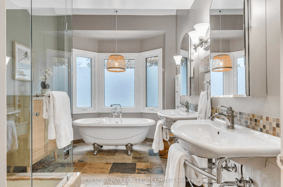 The bathroom on the second floor. Heated floors, a clawfoot soaker tub, and a custom glass shower in a Leslieville detached under $2M is not a given. And we're simply left swooning.