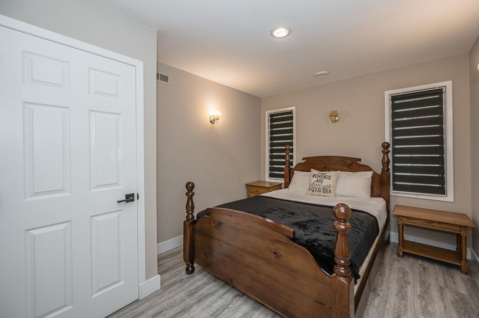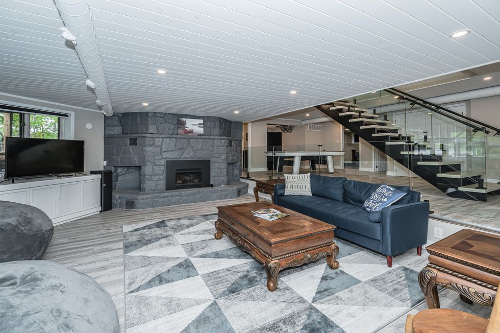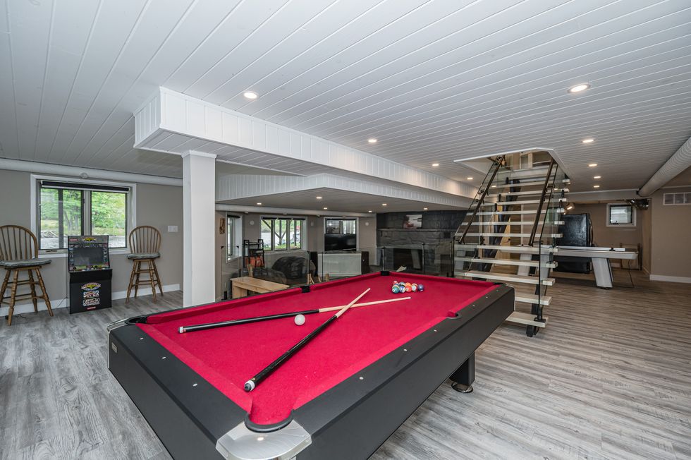 On the lower level, a spacious recreation room beckons for company on chilly evenings or rainy afternoons. A second propane fireplace and a large sitting area create a cozy space for movies or board games, while additional bedrooms and a bathroom ensure visiting guests can enjoy some (much-needed) R&R after a long day in the sun.