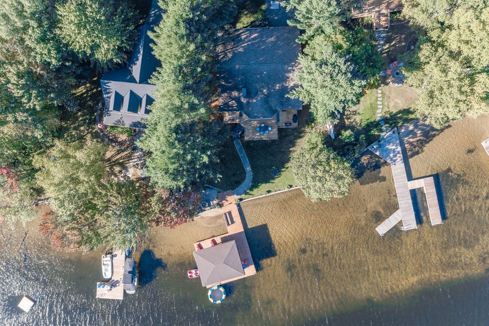 Natural light floods the home through floor-to-ceiling windows and patio doors, providing unobstructed views of the water — and the beautifully treed, undeveloped shoreline beyond.