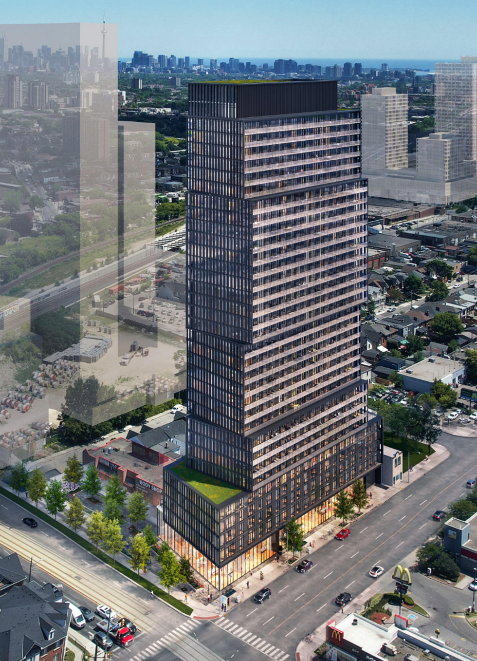 The relatively slim, 23,745-sq.-ft site is located at 611-623A Keele Street on the corner of St Clair Avenue West and Keele Street and just 300 metres from the planned St. Clair-Old Weston GO Station. Once complete, the development would consist of a five-storey podium with a 28-storey tower element, featuring designs from architects—Alliance.