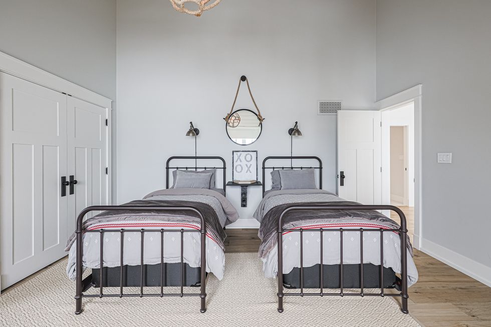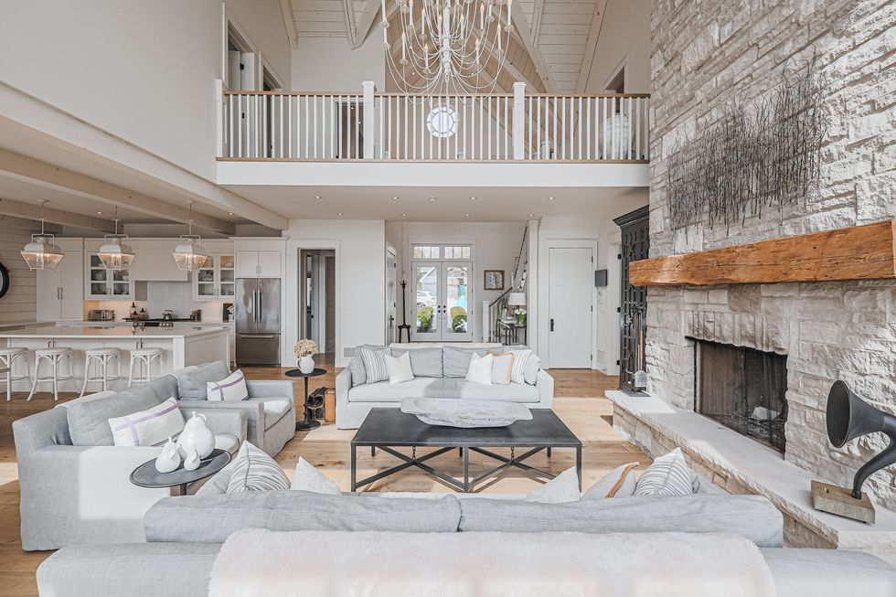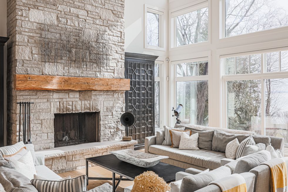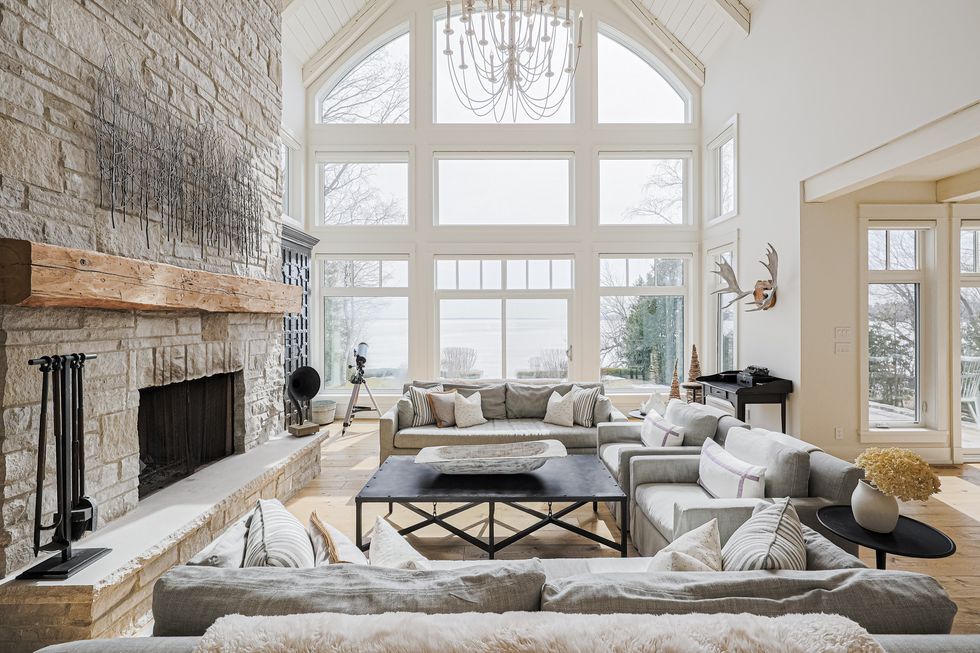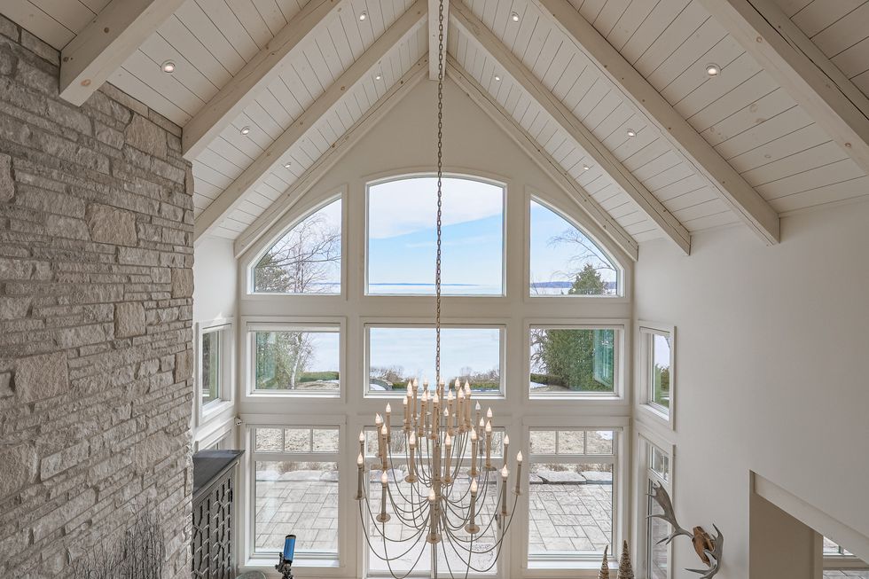 This abode's two-storey great room is a showstopper, with its towering wood-beamed ceiling, full-height stone fireplace, and wall of windows creating a space that’s as cozy as it is grand. Whether you're curled up in winter or watching the water glitter in summer, it's the heart of the home in every season.