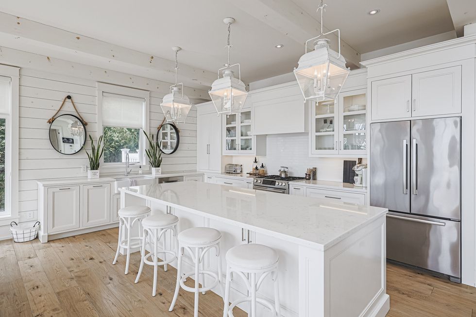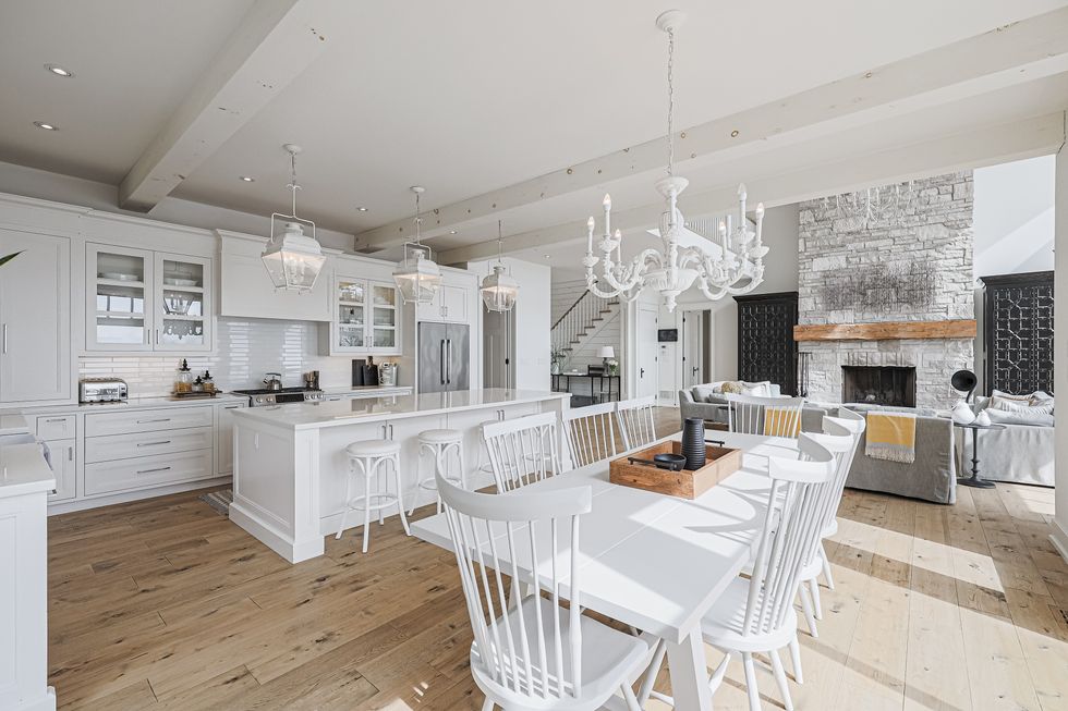 The main living area flows effortlessly into the kitchen — an entertainer’s dream, with a Caesarstone-topped island, propane stove, tiled backsplash, and more than enough space for morning pancakes and sunset cocktails alike. The adjacent dining room completes the layout, inviting big family dinners or casual lakeside lunches.