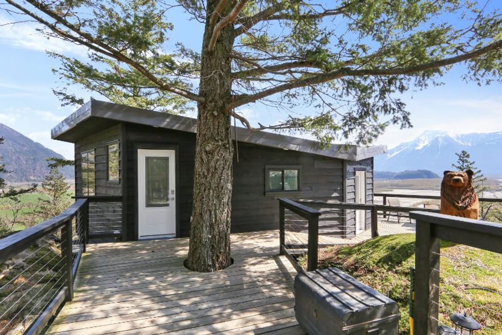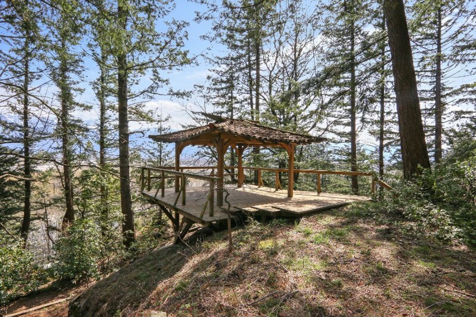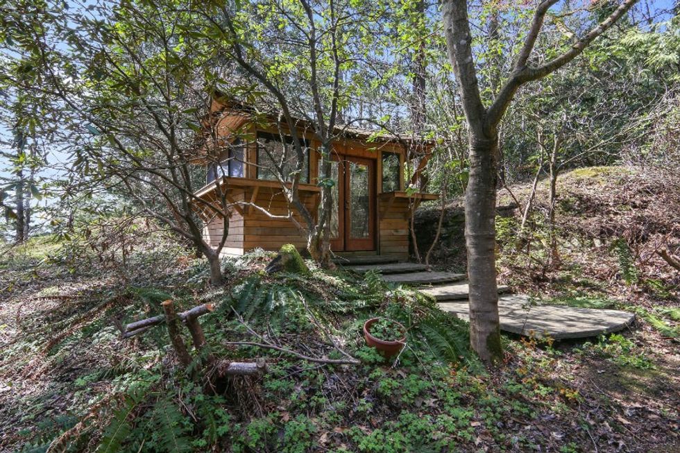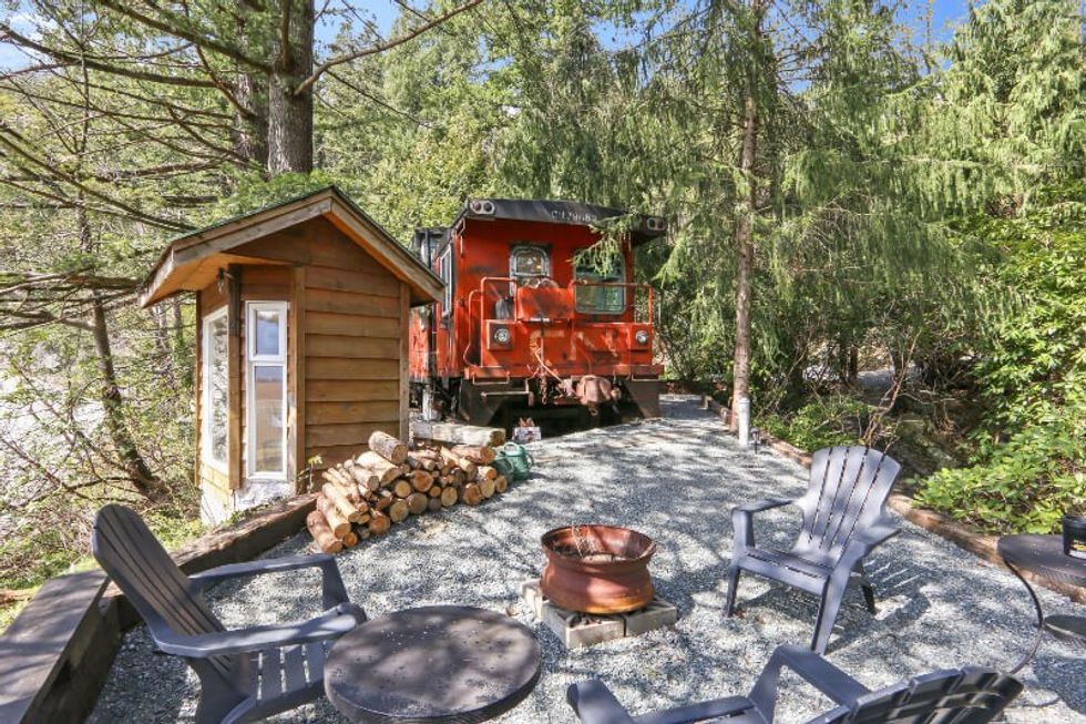 Owners will have access to the two-storey main house, a secondary treehouse-like home, and a third small home within a converted caboose — railroad car — all of which sits atop elevated cliffs with gorgeous vistas.