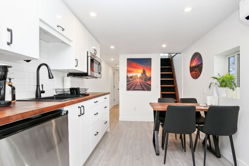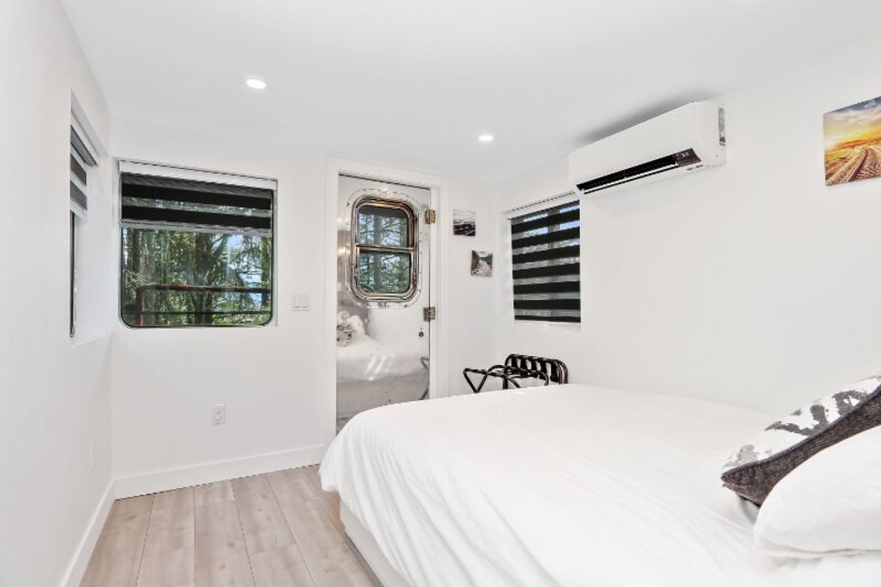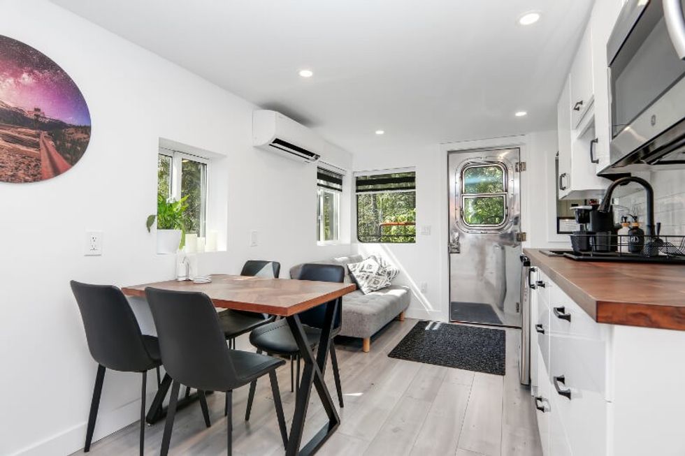 The 363 sq. ft caboose is another inviting space, with a 14' x 9' central living area that includes the lounge and kitchen. The rear of the railcar houses the bedroom, with a secondary loft waiting upstairs.