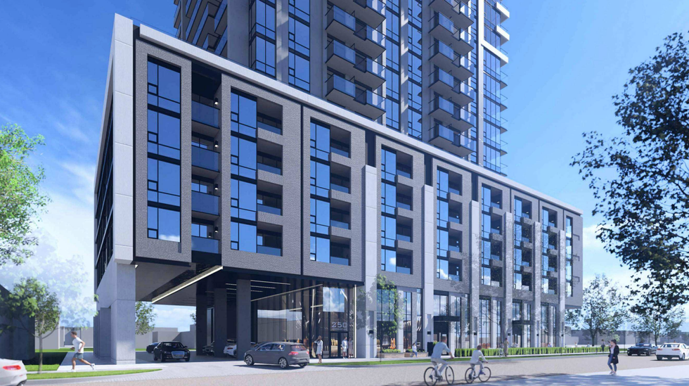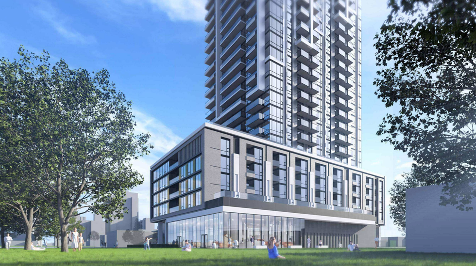Inside, the 455 dwelling units would be divided into 11 studio apartments, 90 one-bedrooms, 227 one-bedroom plus dens, 81 two-bedrooms, and 46 three-bedrooms. Residents would have access to 9,795 sq. ft of indoor amenity space spread across the ground and sixth floors, along with 9,784 sq. ft of connected outdoor amenity space in the form of terraces atop the building's podium element.