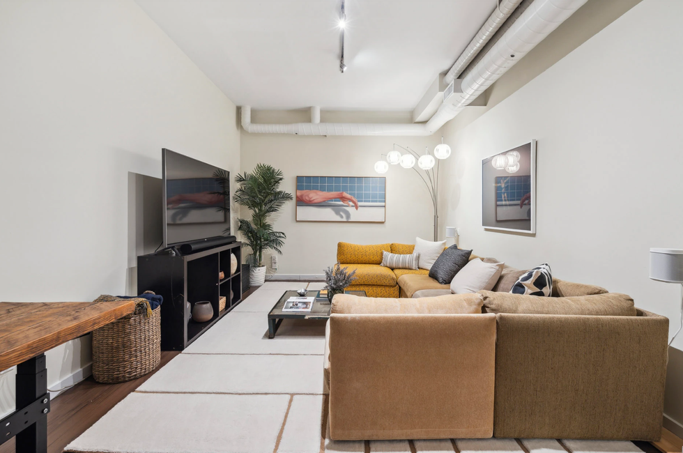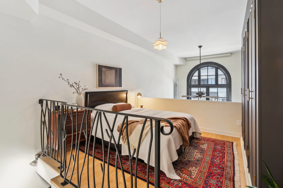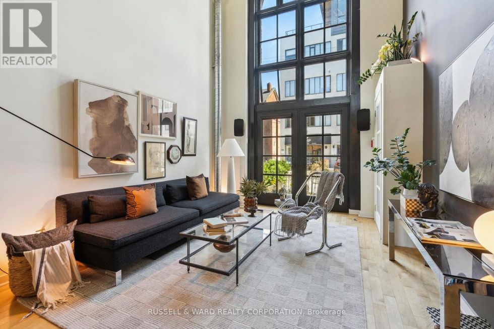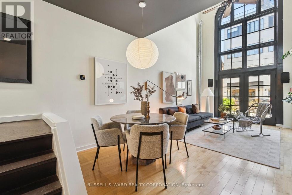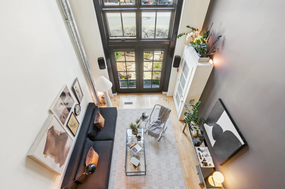 The open-concept space features soaring ceilings with wall space perfect for displaying art. With a dramatic floor-to-ceiling arched warehouse-styled window, an abundance of natural light floods the ground level making it a scene stealer. Sightlines into every room on the main floor makes the space the heart of the unit and spot to entertain guests.