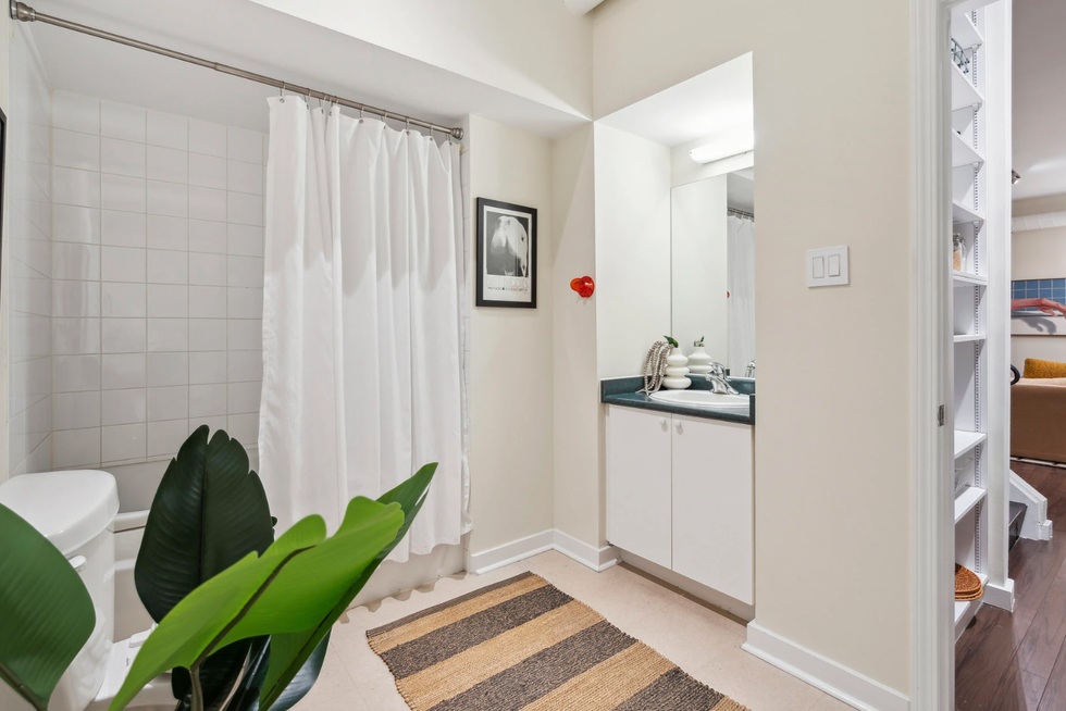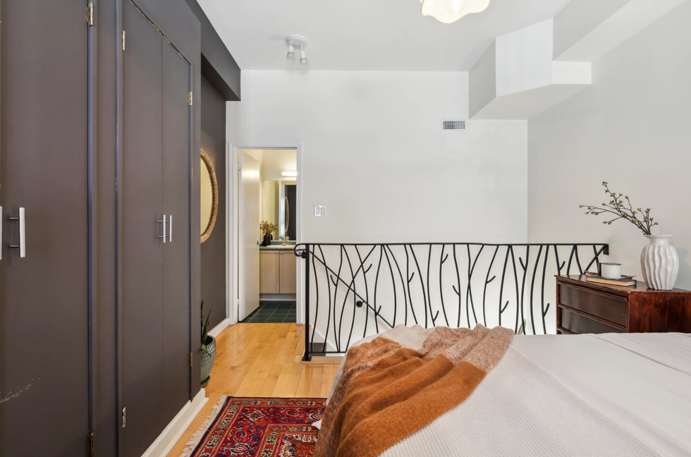 Up the stairs is the airy primary bedroom that floats above the living space. The cozy room fits a queen-sized bed and features a built-in dark-coloured wardrobe. The room is level with the top of the unit’s large window, allowing the rising sun to naturally wake you as it pours into the space at dawn. Across the hall is an ensuite that can be private or used by guests. (But we suggest keeping this one to yourself and directing visitors to the second full bathroom in the basement.)