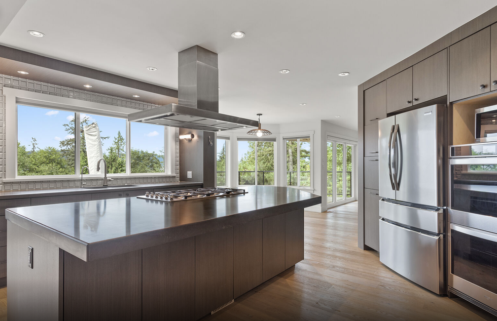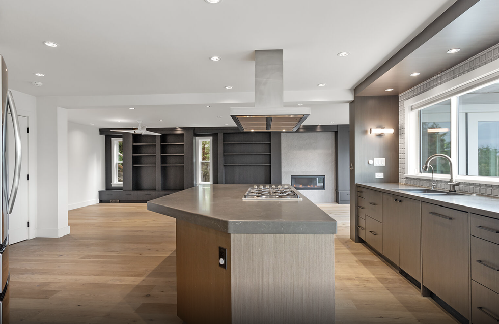 Upon entry, down a short set of stairs, lies the corner living room, which features elegant built-in blackwood shelving, a central fireplace, and numerous windows on two sides that look out onto the patio — and beyond. Next is the central kitchen, which features an array of top-of-the-line stainless steel appliances built into the minimalistic cabinetry and central island.