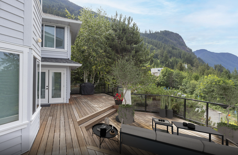 And finally, there's all the outdoor space. Out back, a large patio spans the entire width of the main level, providing enough space for multiple lounge spaces — plus a barbecue station. A private stairway begins at the front of the property, winds past the side of the property, and reaches through to the road below, serving views of meticulously-landscaped green spaces all the way down. It's tremendously scenic, just like life in Lions Bay.