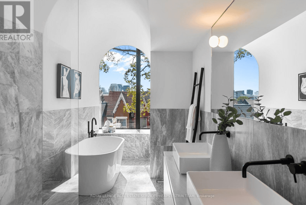 Across three levels, the home unfolds with four bedrooms and six bathrooms, each designed to complement the overarching architectural vision. The third-floor primary retreat stands out as a statement within a statement, featuring custom millwork, a spa-like ensuite, and access to a private terrace that feels worlds away from the bustle below.