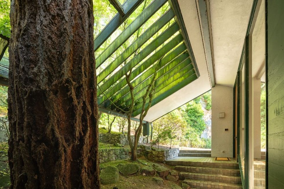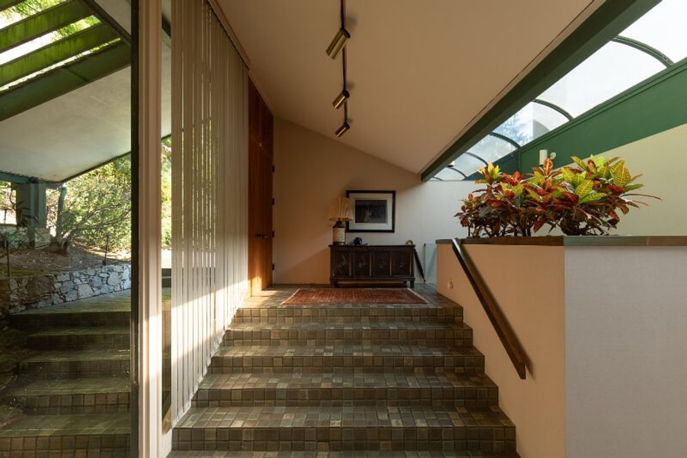 The design of the home stands out before you even step inside, as the walkway leading up to the main entrance of the home sits below an open-air solarium-like space, with glass panels that reflect the green of the surrounding trees down onto the entryway.