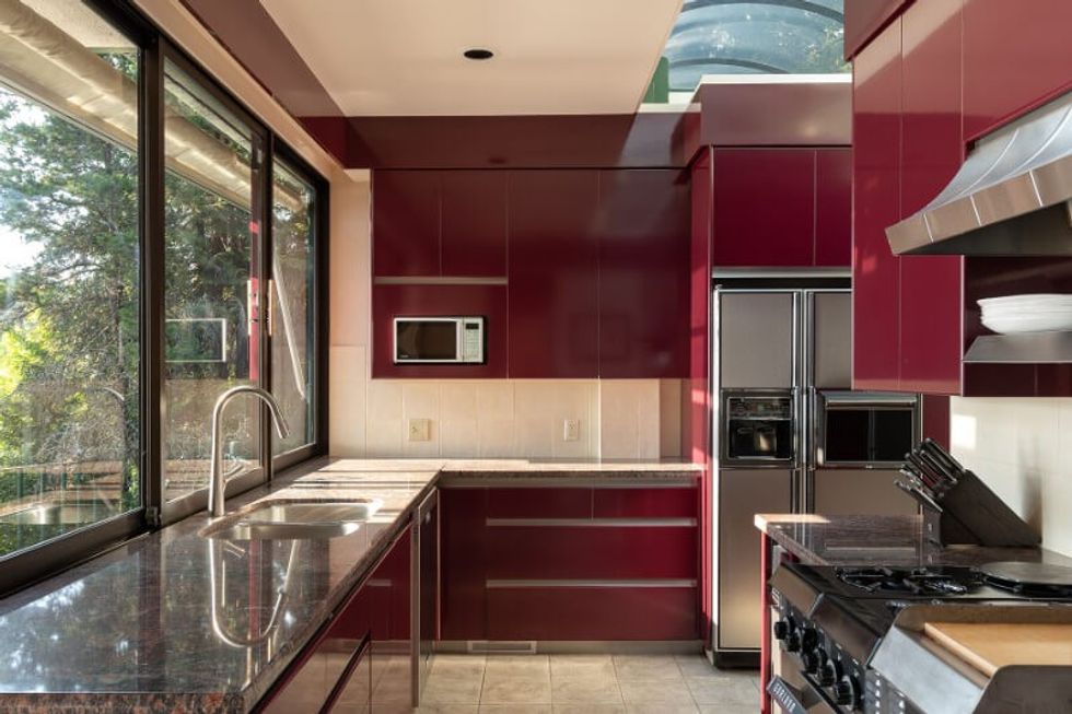 The home's use of red and green, opposite ends of the colour wheel, shows the attention to detail that went into its design. Green is used as an accent colour in outdoor spaces or near the windows and sunroofs (which invite the natural green from outside to pour into the home), while red plays the same role for the indoor spaces, such as above the main living area and in the kitchen.