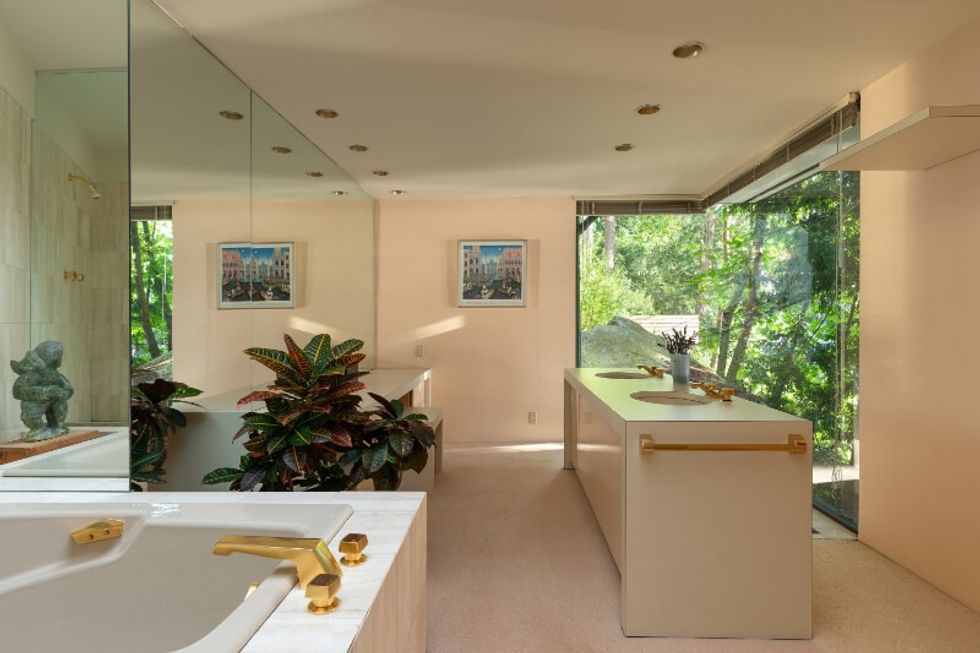 On the other end of the main floor is the primary bedroom, which yet again includes an entire wall of windows overlooking the water. This retreat also boasts a stunning ensuite bathroom that utilizes creative placement of windows, sunroofs, and mirrors to welcome an abundance of natural light, all while remaining private. Think: a bathroom in the middle of the jungle.