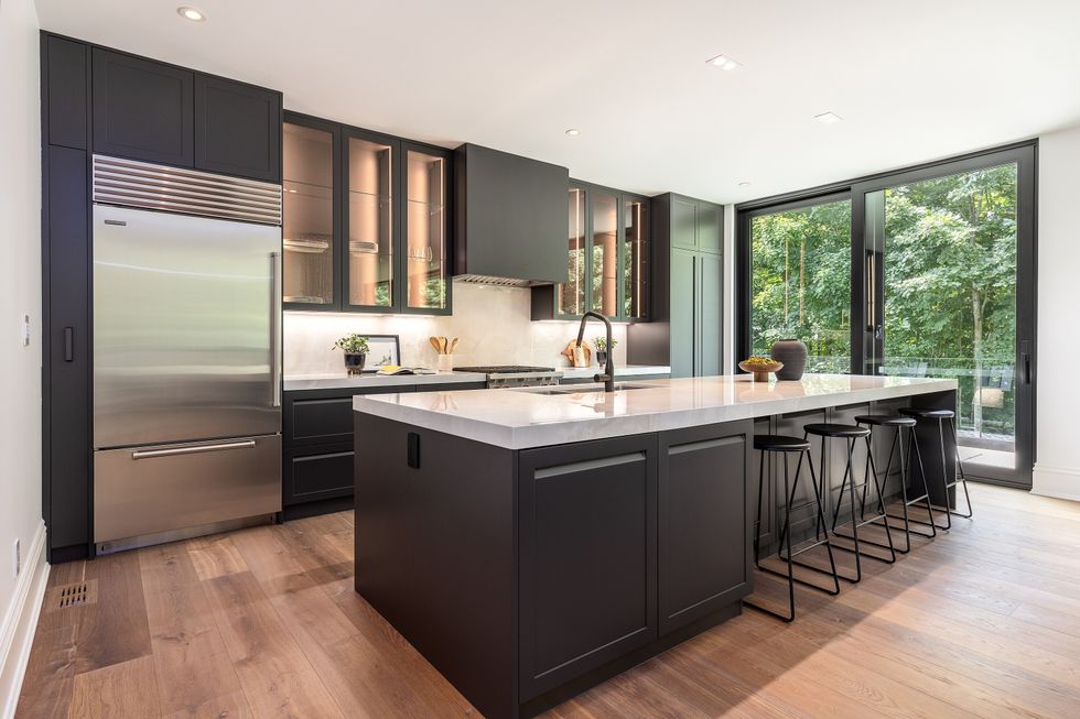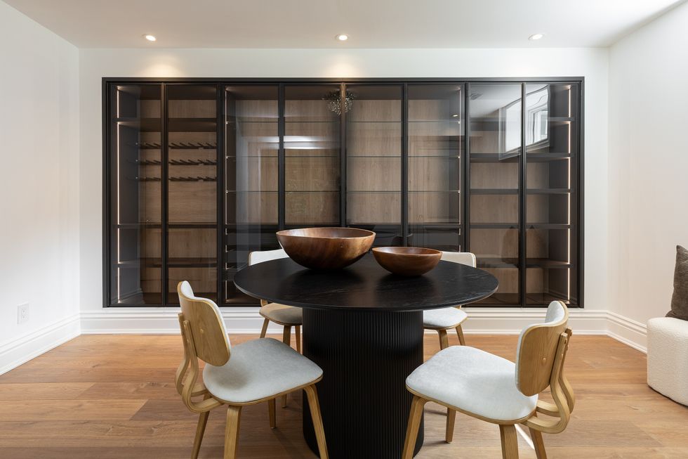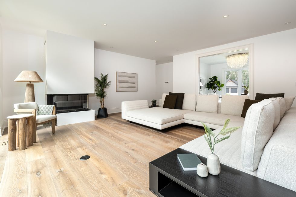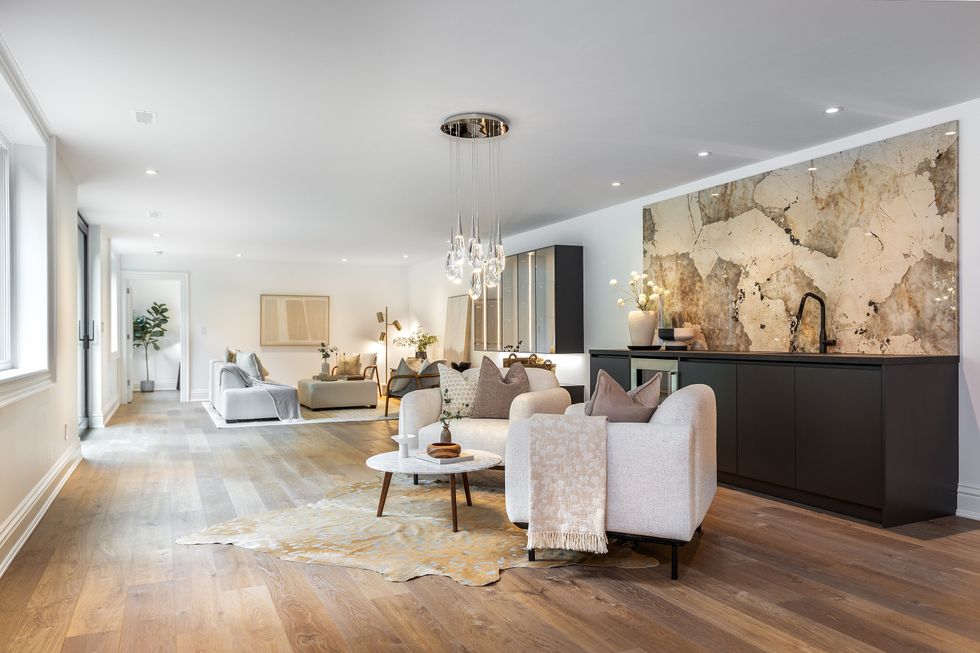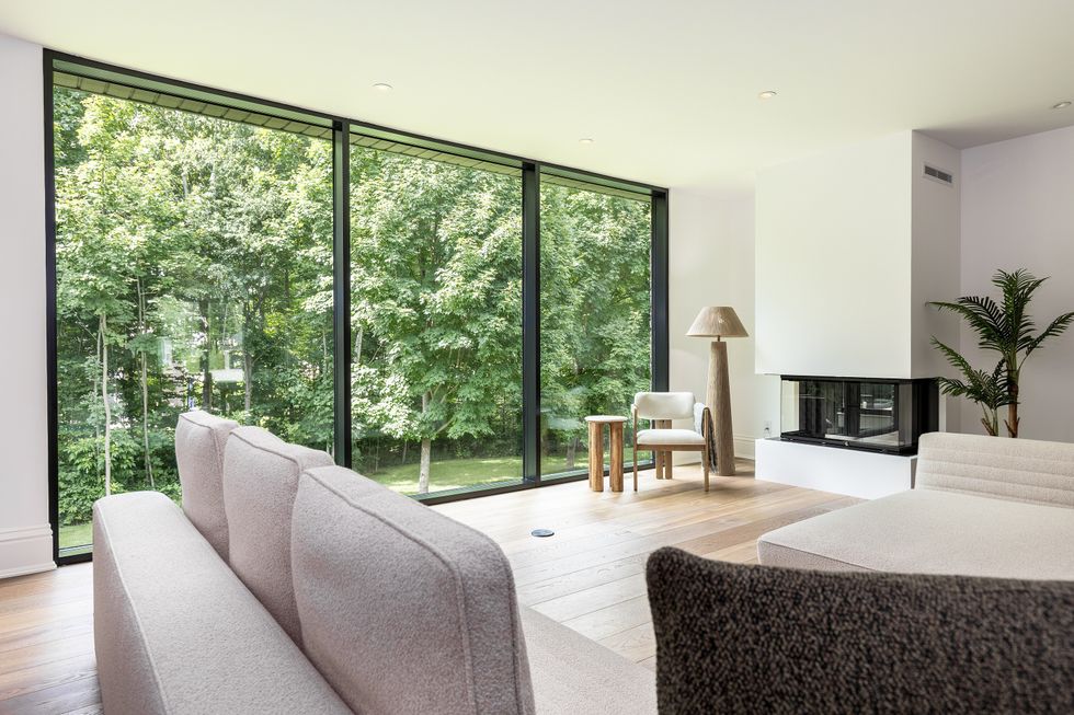 The kitchen, which comes complete with a SubZero fridge Wolf gas range and Miele dishwasher, is further elevated by custom Scavolini millwork, striking cabinetry, and a massive marble-topped island. But the highlight of the space is the Spartherm Arte 3-sided wood-burning fireplace, which serves as a focal point to gather with friends and family.