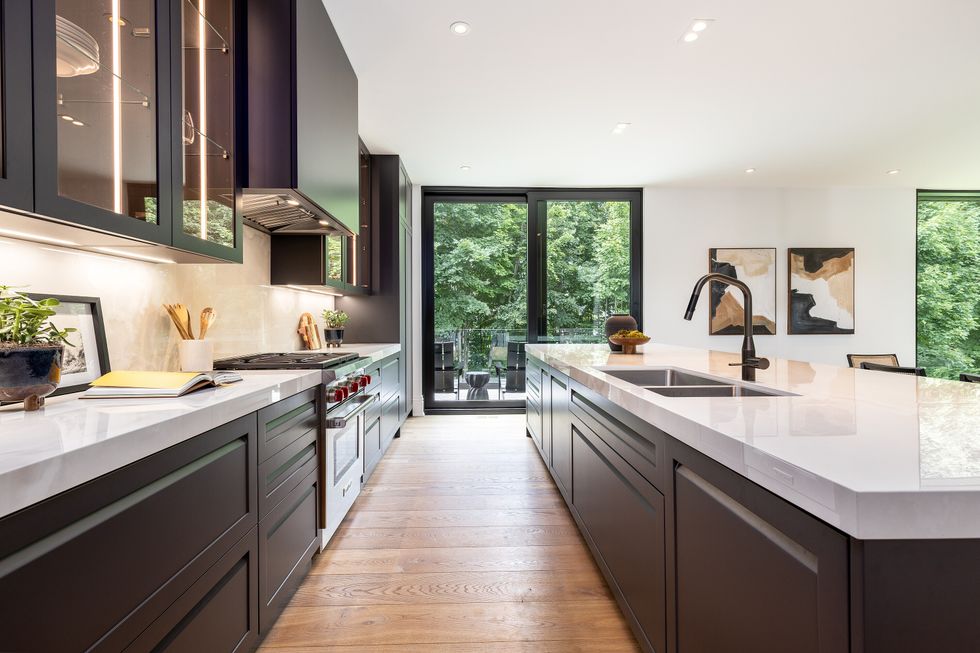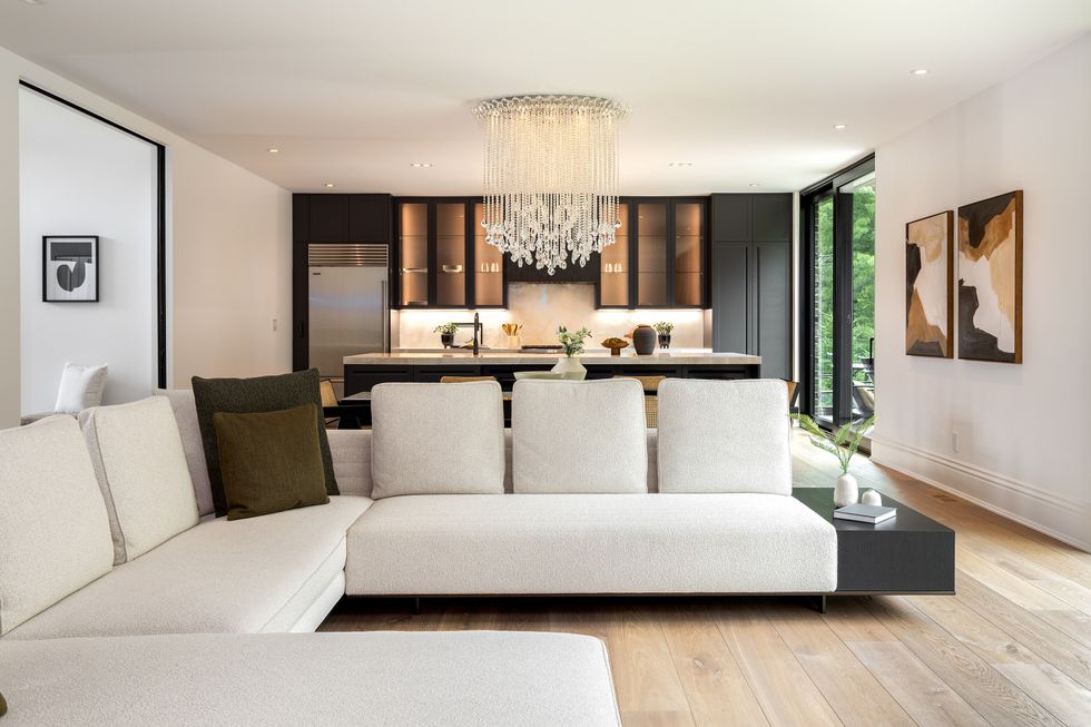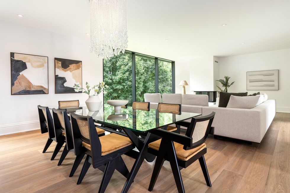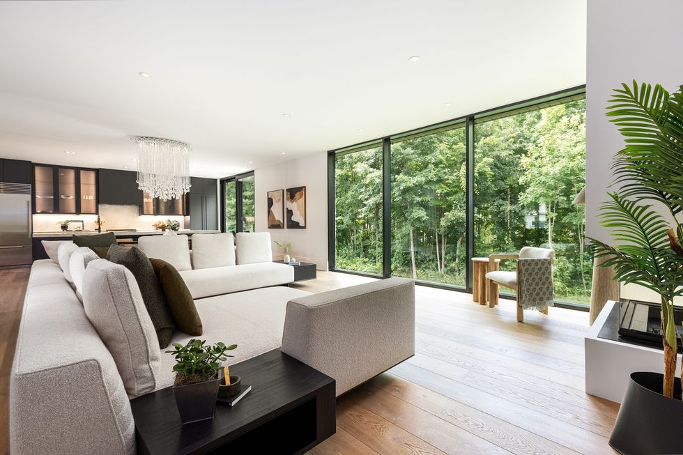 Between the kitchen, dining, and living spaces, all three areas flow seamlessly into one another, with each enjoying stunning views through windows that span nearly wall-to-wall and floor-to-ceiling.