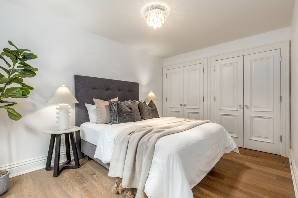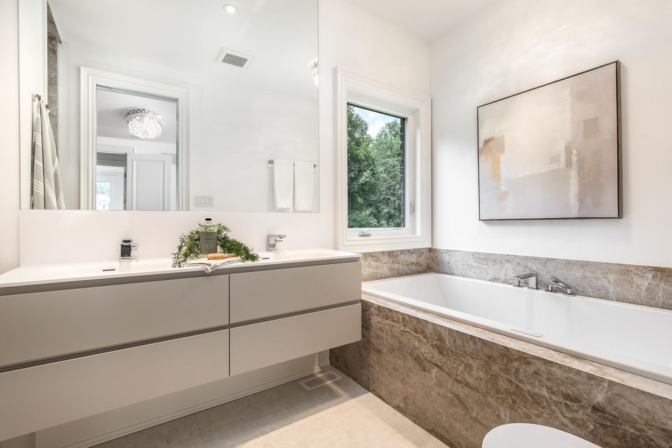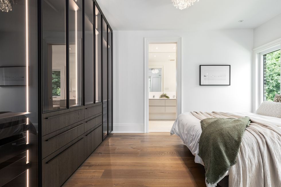 When it comes time to retire for the evening, the spacious primary suite — with custom closets and its own five-piece ensuite — beckons... as does the spa-like bathroom's marble-encased jet tub.