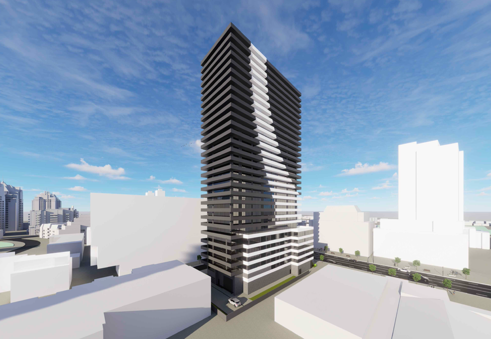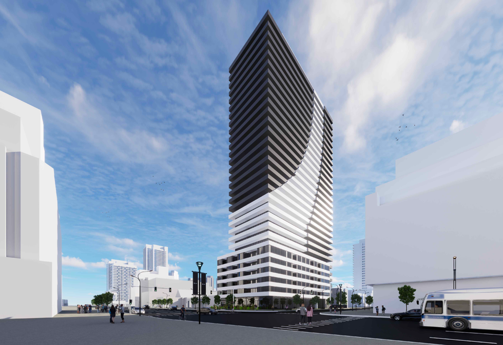Renderings prepared by Icon Architects show a six-storey podium with commercial space located along the Sheppard Avenue East frontage. The podium juts out slightly beneath the the angular 24-storey tower, which, perhaps most distinctively, features a white wave-like design that undulates vertically along the building faces.