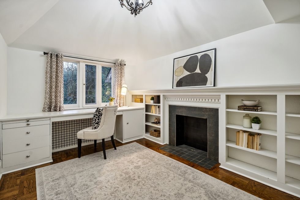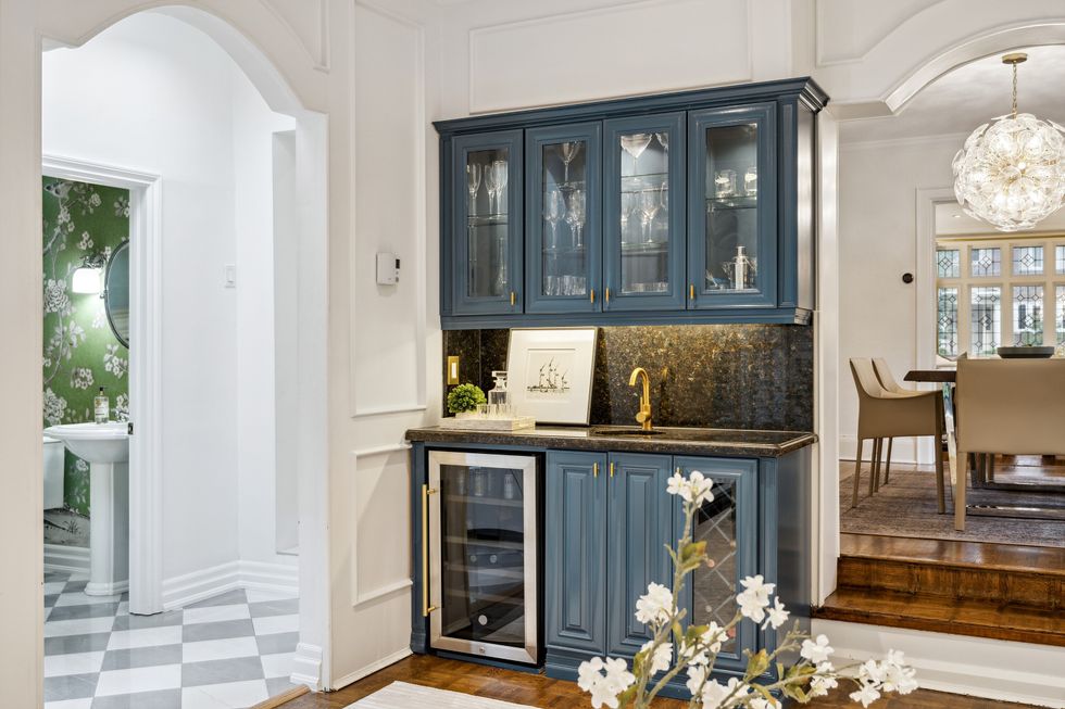 Inside, the ambiance continues, as a charming sitting room greets you upon entry, elevated by a marble-lined fireplace and row of those aforementioned leaded windows. Flowing towards the back of the home is a stately dining room, and finally, the sunken living room, defined by a gorgeous wood-burning stone fireplace, high coffered ceilings, and a stunning wet bar whose muted blue cabinets lend the space a rich pop of colour.