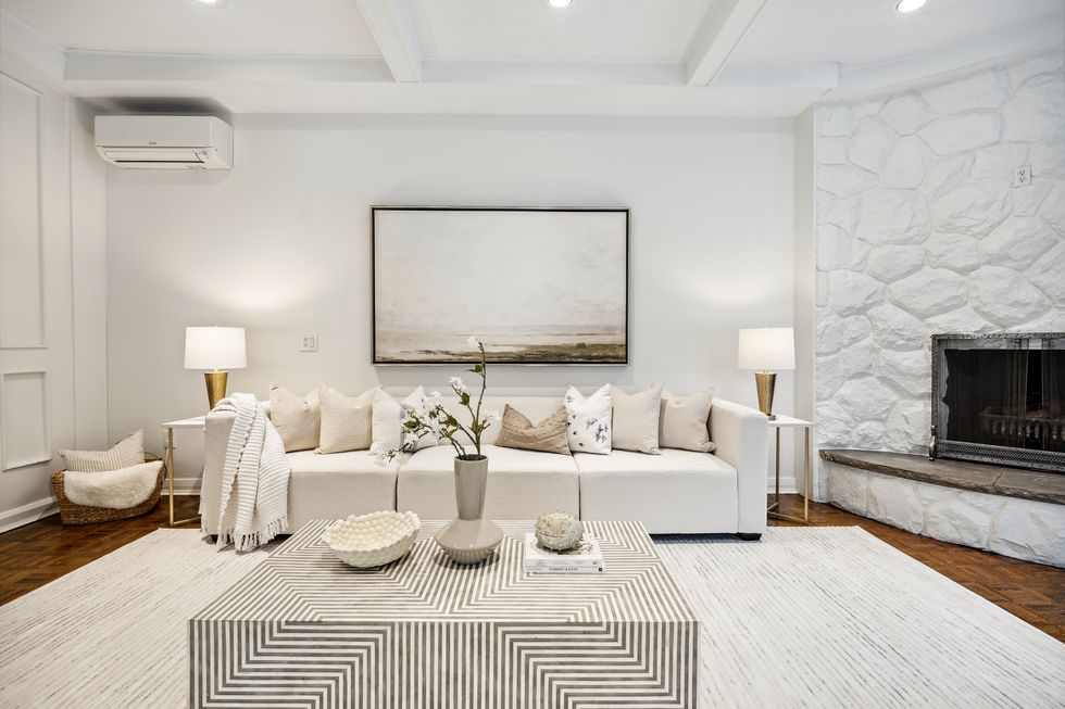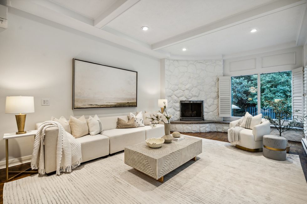 Across from the living room sits the kitchen, complete with top-of-the-line appliances, quartz counters, and a convenient breakfast area. The polished space is further elevated by glass display cabinets and tasteful gold finishes throughout. The kitchen also offers direct access to the home's recently landscaped backyard (— and more on that soon).