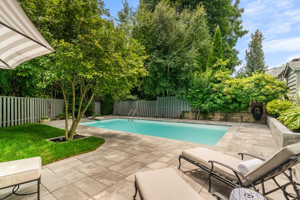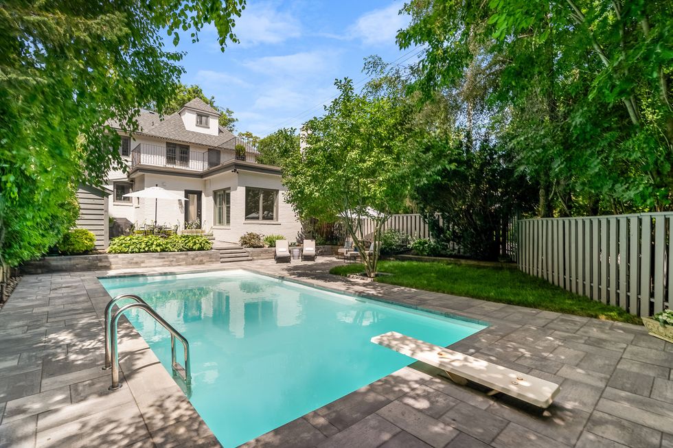 Last but certainly not least, you're invited to spend hours in the sun enjoying the backyard's in-ground saltwater pool (and yes, there's a diving board), or lounge in one of the stone patio seating areas shaded by a cocoon of greenery.