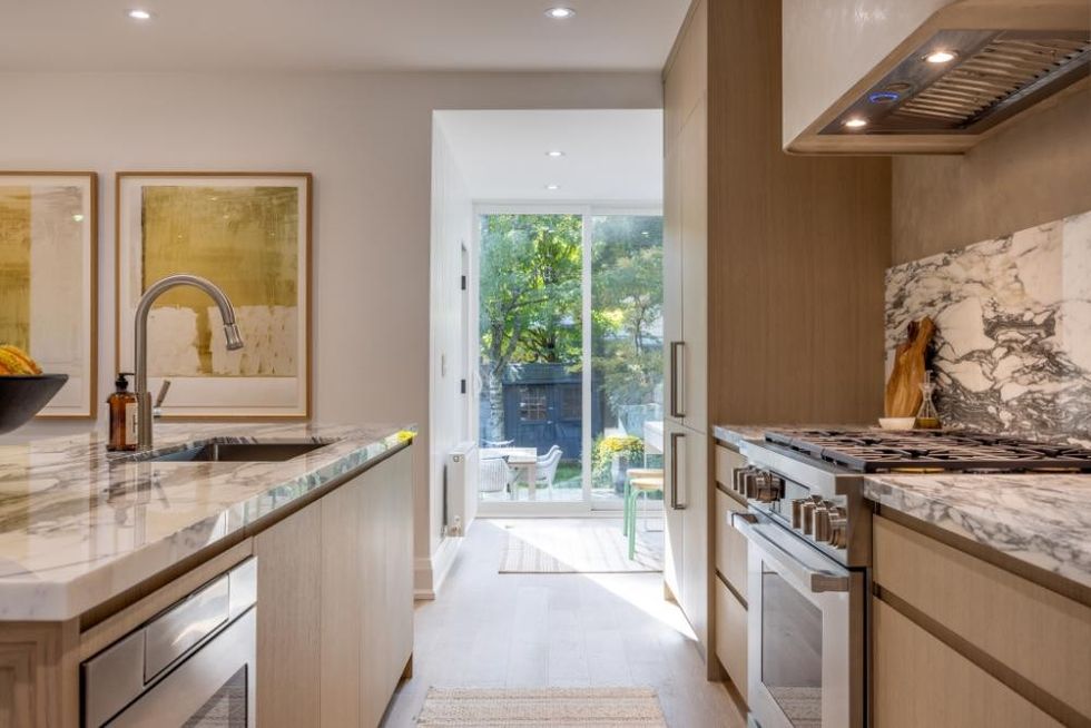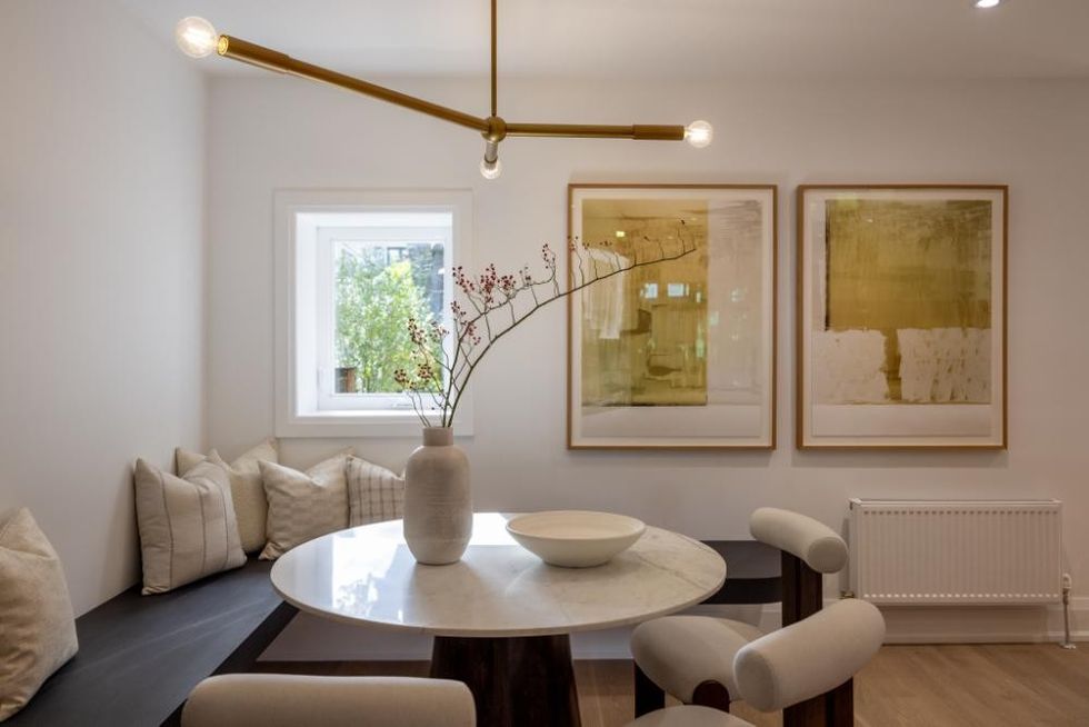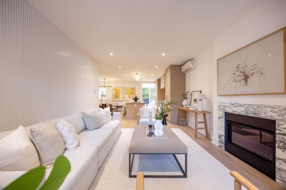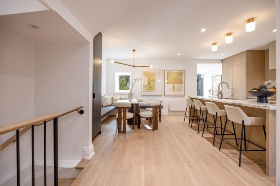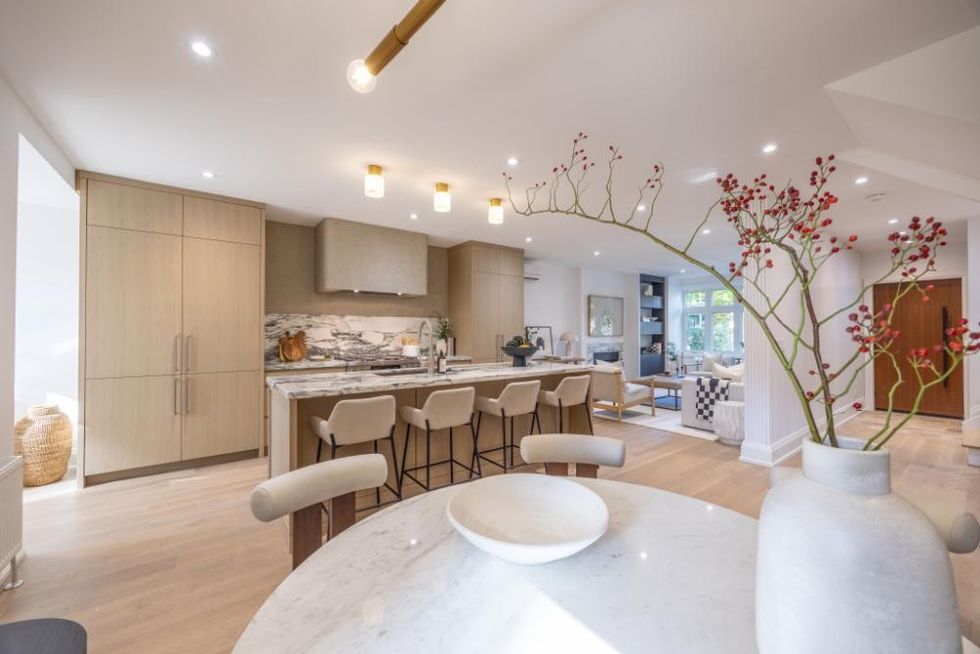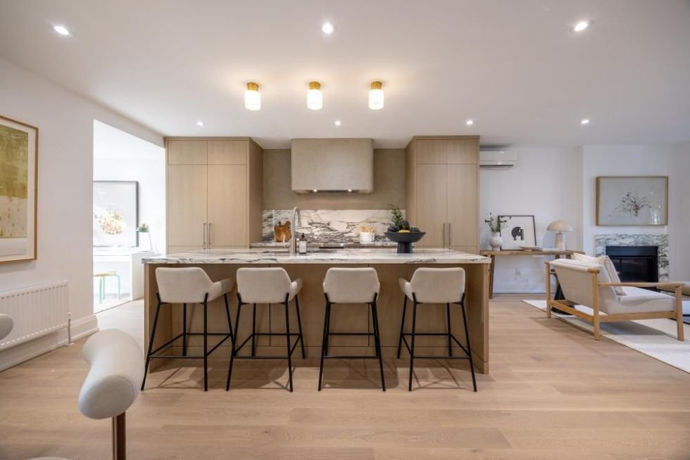 Beyond the entryway, an open-concept floor plan is home to the living room, kitchen, and dedicated dining area — spacious and airy, it's a central hub as perfectly suited to family time as it is larger-scale entertaining. And there are countless fine details throughout, which elevate the interior's feel to one of quiet luxury; the living room is anchored by a marble-framed gas fireplace, for example, while the kitchen features custom white oak design, marble counters, a sprawling centre island, and a custom built-in banquette.