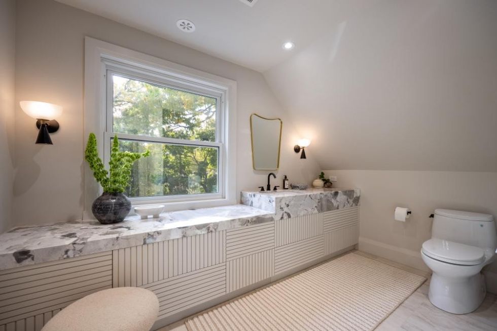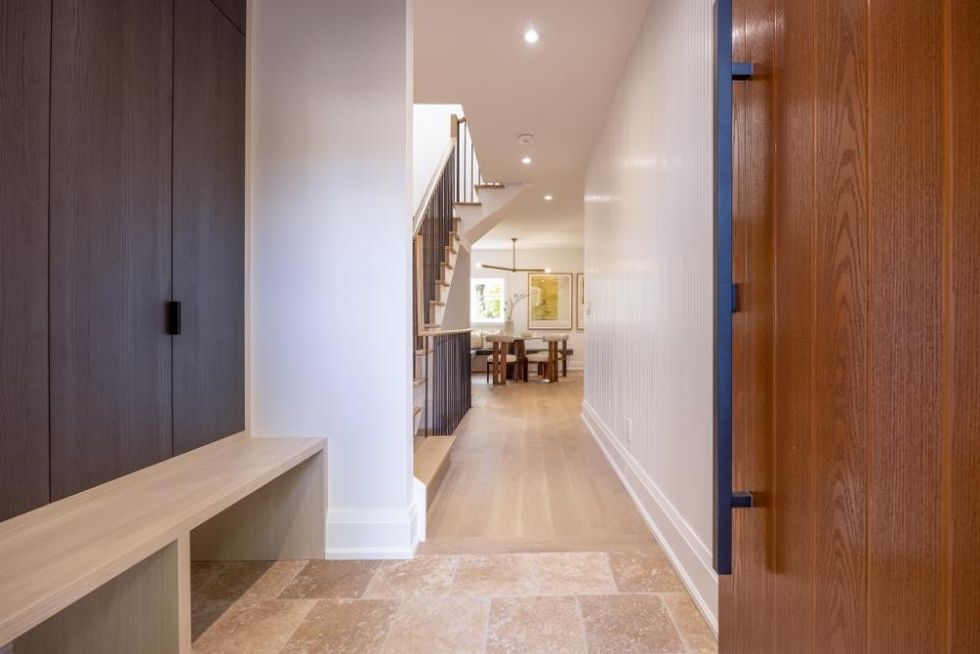Inside, the welcoming vibes continue, with fluted walls, travertine flooring, and custom built-ins (in the form of a bench and closets) in the front foyer.