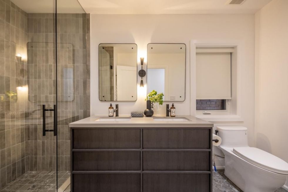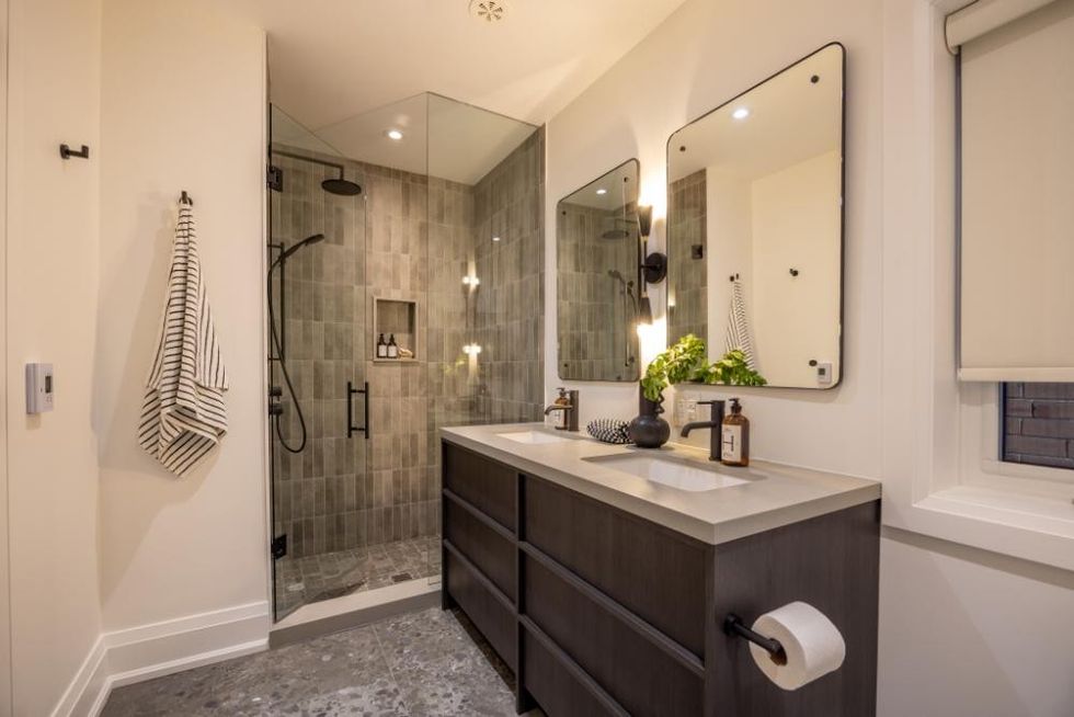 On this storey you'll find three beds — one of which is kind-sized, complete with an ensuite and walk-in closet — and a total of two baths. The shared bathroom is finished with heated floors, double sinks, custom vanities, and a walk-in glass shower.