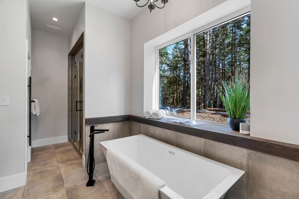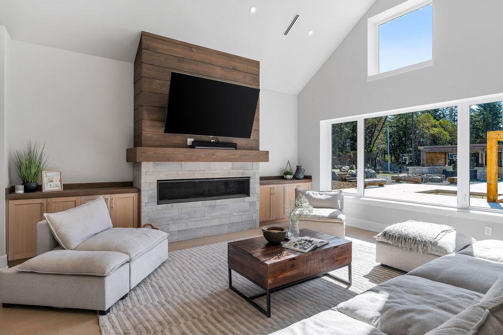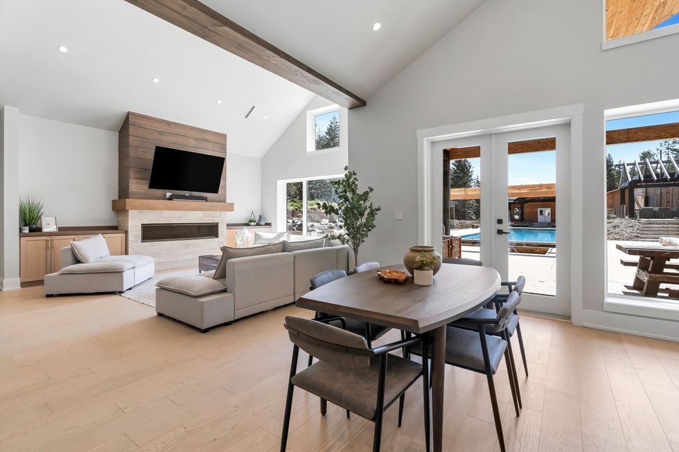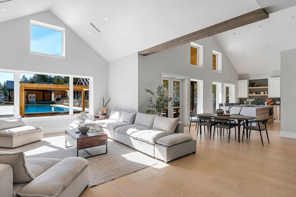 Inside, meanwhile, the architecture opens up dramatically — vaulted ceilings, oversized picture windows, and a warm-yet-modern material palette create an ambiance that is at the same time grand and welcoming.