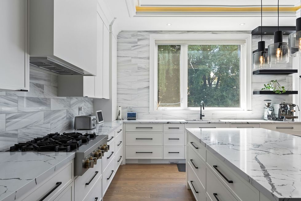 Behind its striking façade, a generous foyer opens to a main floor that was made for both family living and sophisticated entertaining. A cozy living room flows to an elegant formal dining space, connected by a discreet butler’s pantry. A practical mudroom keeps everyday life organized, while the gourmet kitchen — complete with a breakfast nook — anchors the home. Here, an oversized family room framed by expansive windows overlooks the lush rear gardens, making the connection between indoor comfort and outdoor calm seamless.