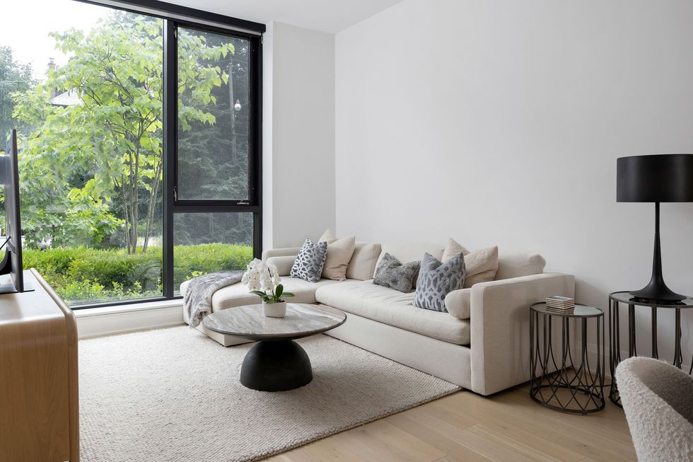 Upon arrival at the address, a manicured front garden greets you. Inside, an open-concept main floor invites you to further discover the spacious layout, which is illuminated by sunlight pouring through large windows.