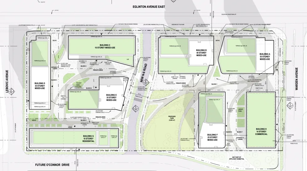 The lot would be bisected with a new north-south road, connecting Eglinton Avenue to O'Connor Drive, with buildings C, D, E, and G on the west side and buildings A, B, F, and H on the east, along with a 42,872-sq.-ft park.