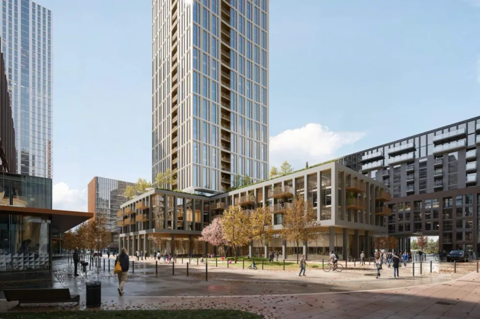 Featuring designs by BNKC architects and landscaping from NAK Design Strategies, renderings of the development are defined by a generous amount of green space, seen in the landscaping and green roofs on each building. The buildings themselves all appear to have unique designs that feature a range of materials and warm, earthy colours.