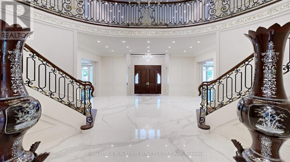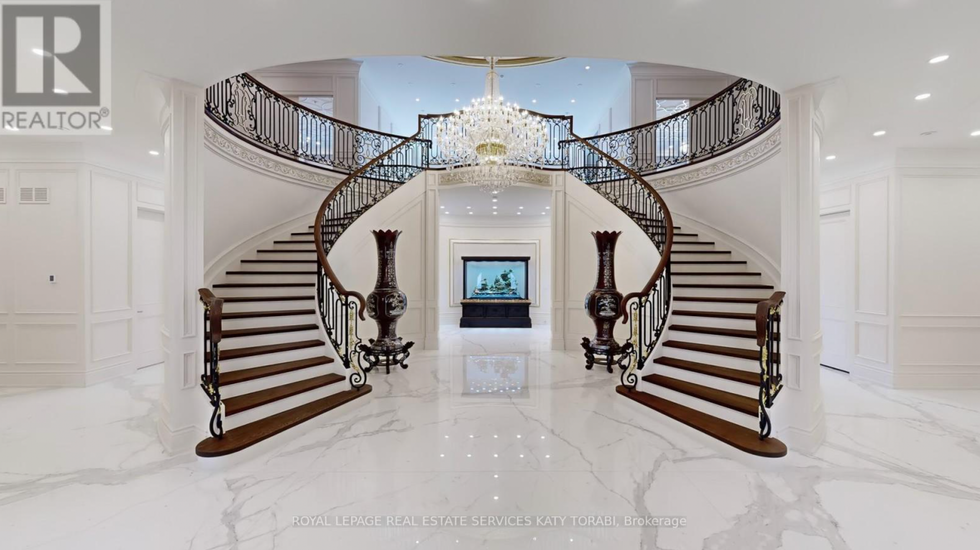 Inside, you're greeted by a curving grand staircase and pristine white marble slab flooring, which covers much of the main floor. As you move through the home, you'll come across regal sitting and dining rooms with soaring ceilings, a state-of-the-art kitchen, and an expansive primary suite decked out with a heavenly white and gold ensuite.