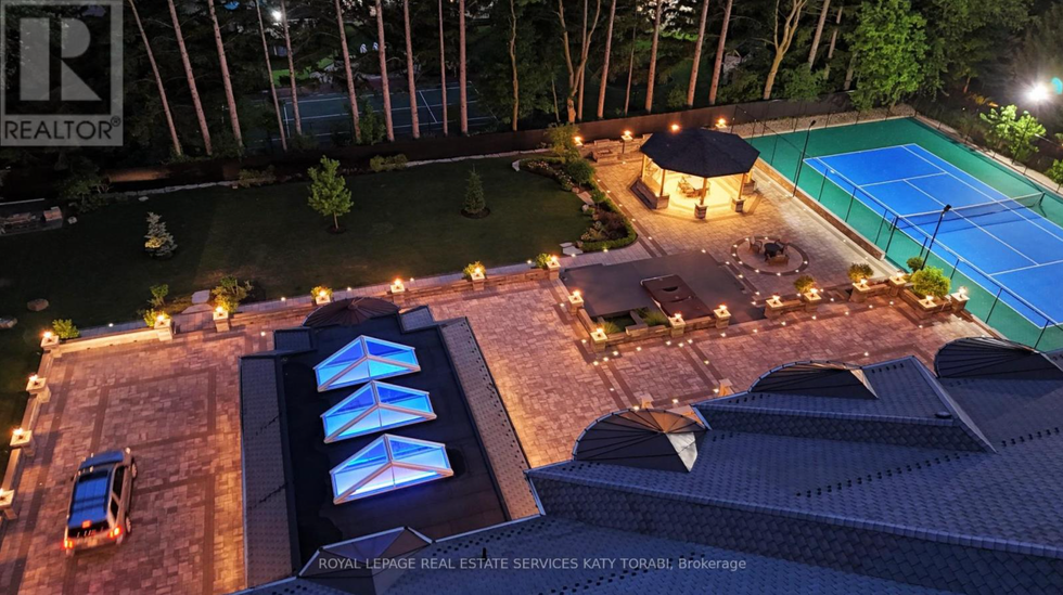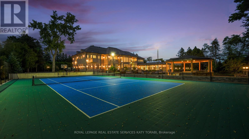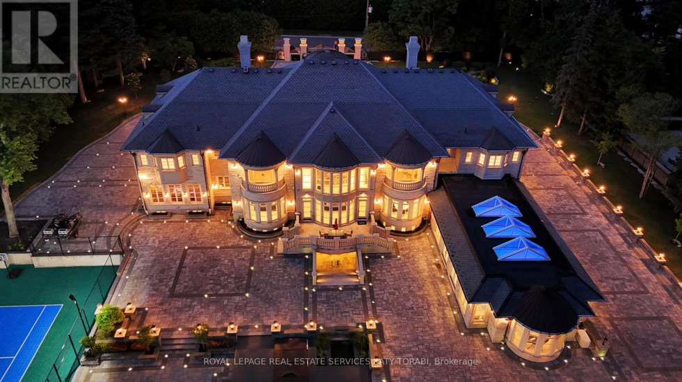 The home itself is truly a sight to see. Beyond ornate double wrought-iron gates lies a seven-plus-two-bedroom, 16-bathroom (yes, 16 bathrooms) palatial abode fit for royalty. And in the way of amenities, it's got everything a prospective buyer could ask for: a home theatre, a spa and steam room, a home gym, an indoor pool, and an outdoor sports court equipped for basketball and tennis.