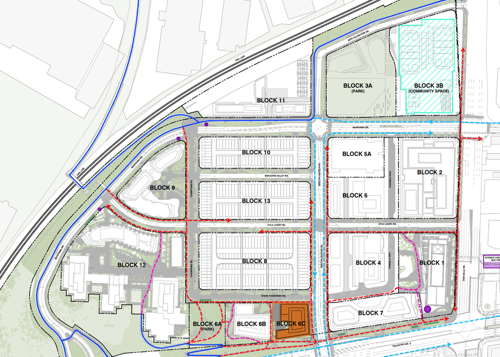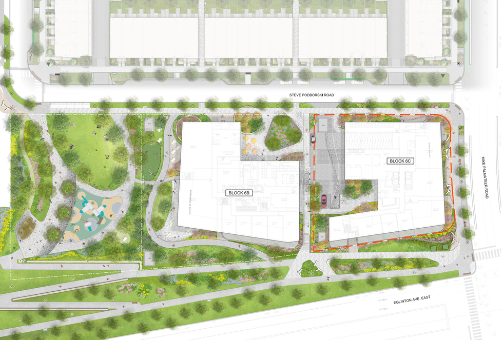Plans submitted in late June support a Site Plan Control application for Block 6C, located in the south-central portion of the larger Crosstown site. The block would be bound by the new Steve Podborski Road in the north (named after a downhill skiing Olympian who trained in the Don Valley), Mike Palmateer Road in the west (named after a former Maple Leafs player), Eglinton Avenue East in the south, and Block 6B in the west, which is envisioned to host a townhome block and a 10-storey residential building. West of Block 6B is Block 6A, where a public park is planned.